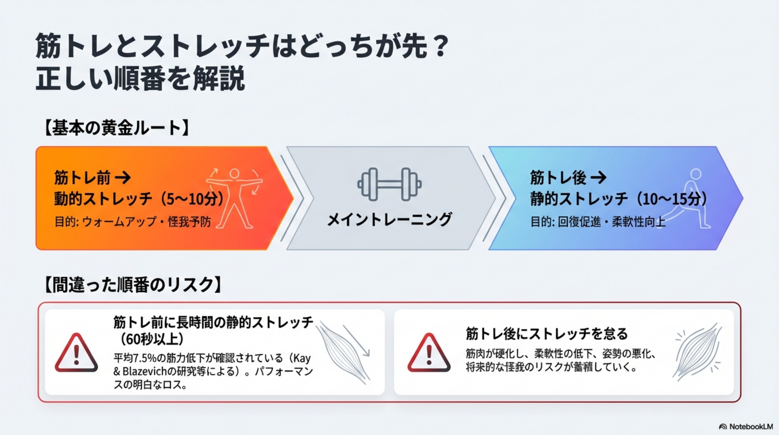 ポイントは、筋トレ前に静的ストレッチを長時間行わないことです。次のセクションで、間違った順番がもたらすリスクを具体的に解説します。