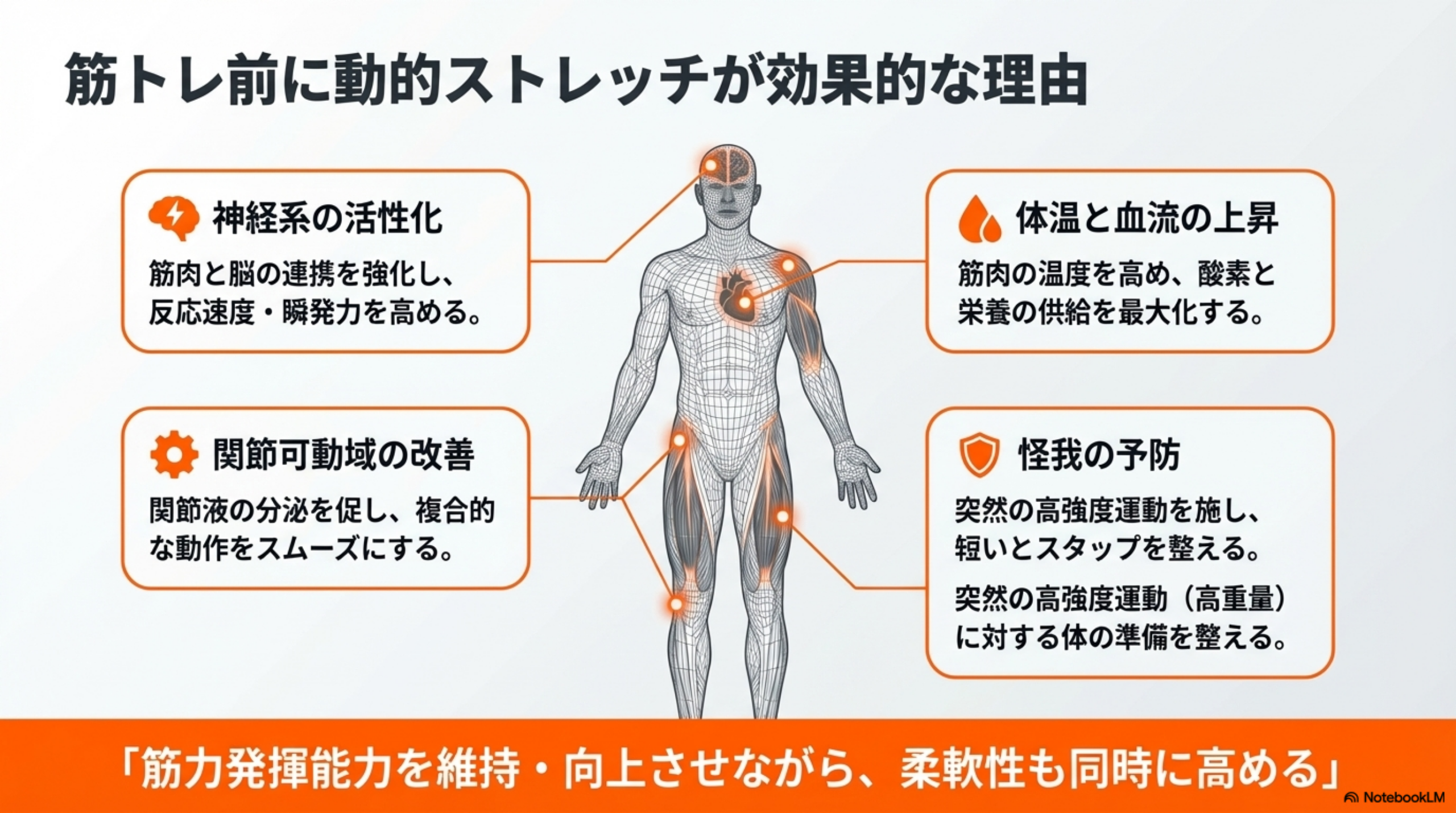 筋トレ前の動的ストレッチには、パフォーマンス向上と怪我予防の両面で明確なメリットがあります。