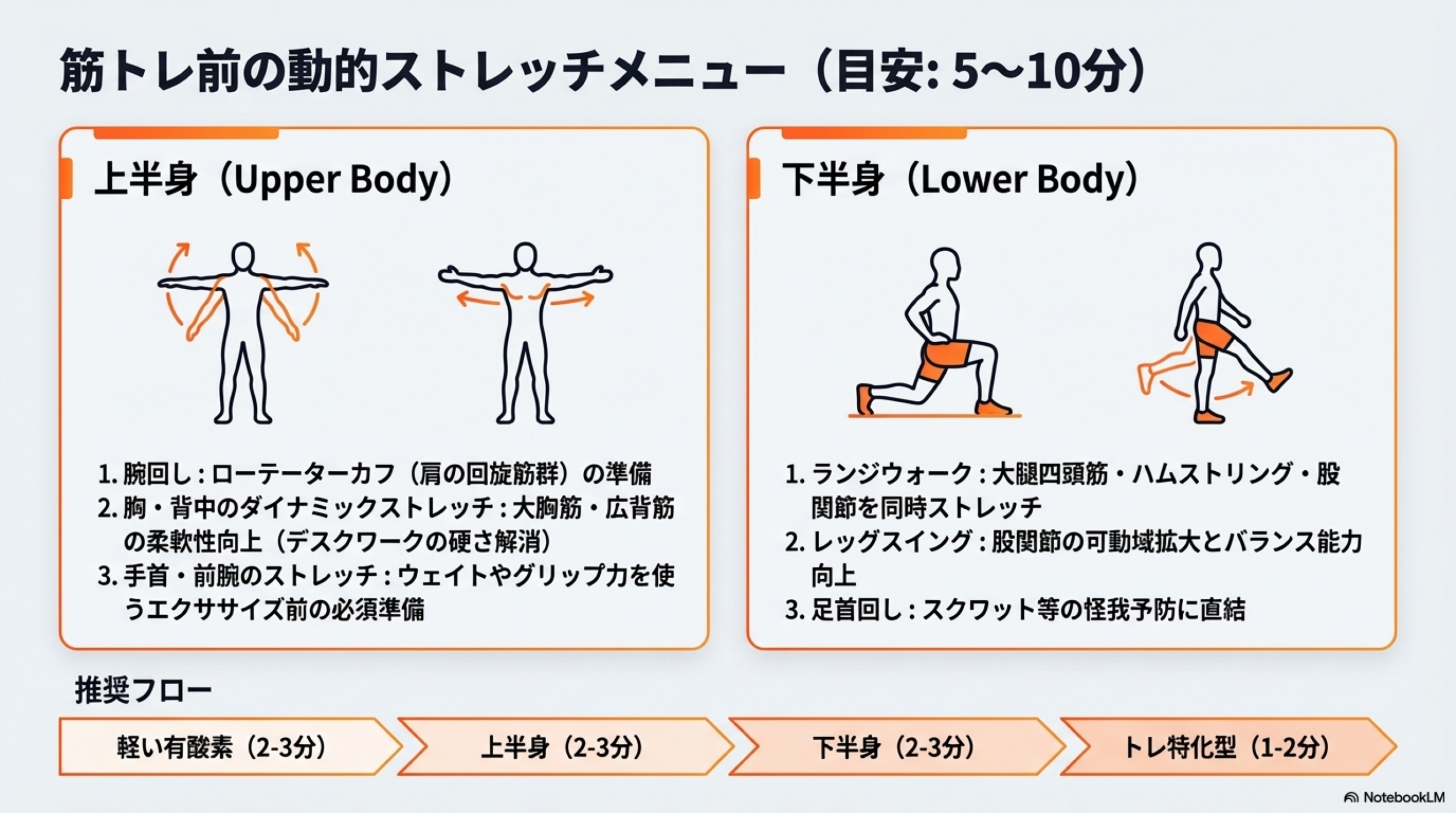 | 筋トレ前 | 動的ストレッチ | 5〜10分 | ウォームアップ・怪我予防 |