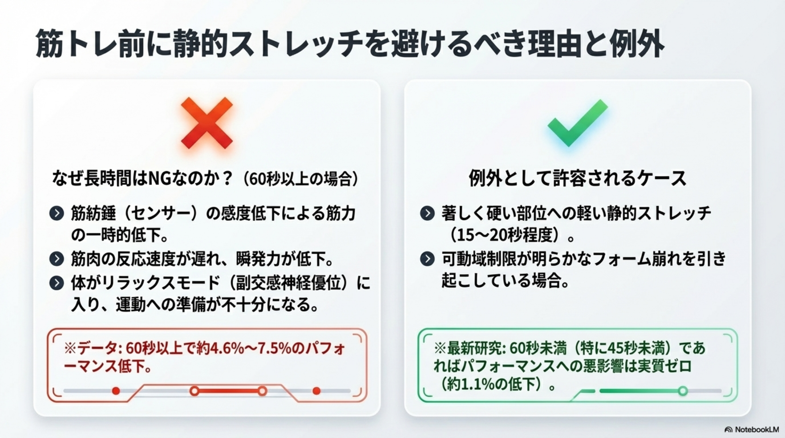 ⚠️ 筋トレ前に長時間の静的ストレッチを行った場合: