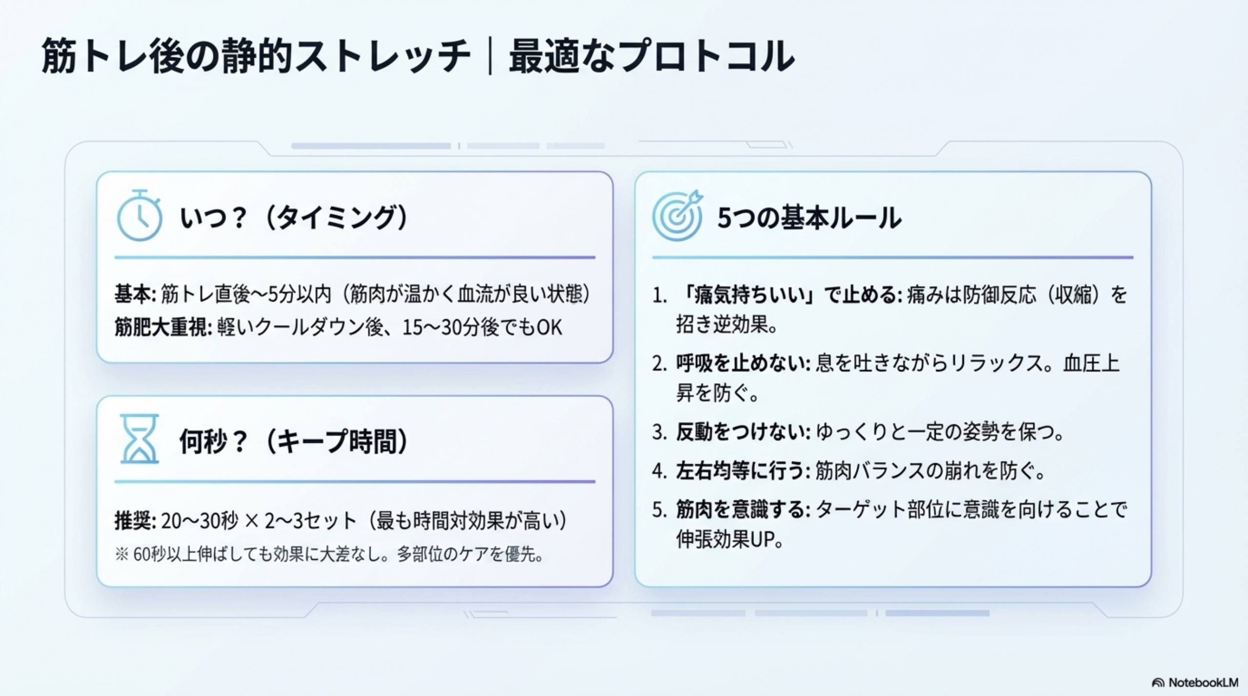 | 一般的な健康・柔軟性 | 筋トレ直後〜5分以内 | 最も効果的な時間帯 |