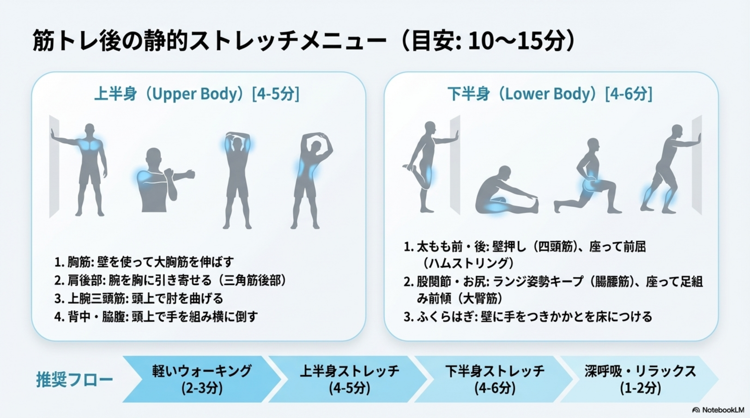| 筋トレ後 | 静的ストレッチ | 10〜15分 | 回復促進・柔軟性向上 |