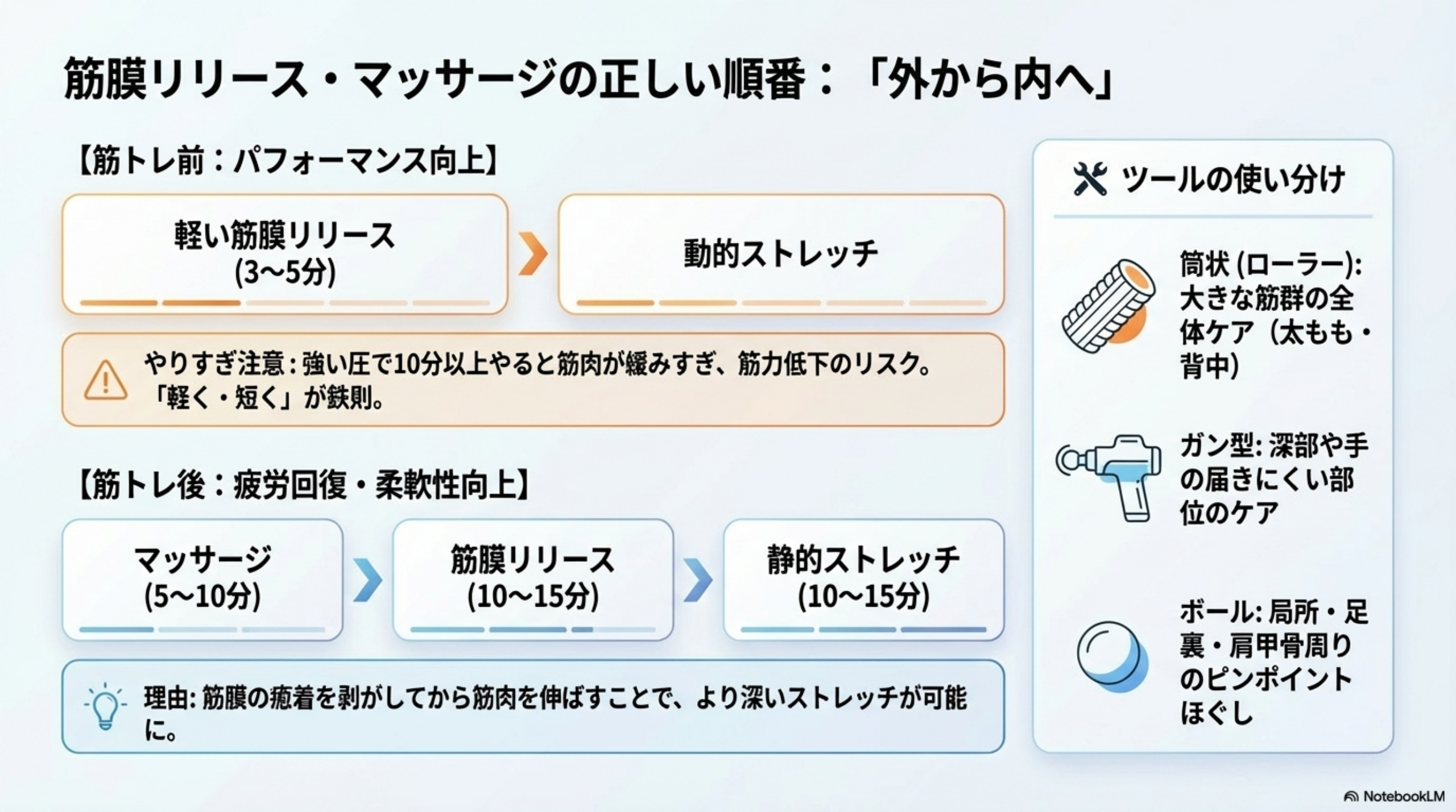 筋膜リリースやマッサージを組み合わせる場合は、「ほぐしてから伸ばす」が原則です。筋トレ前は軽い筋膜リリース→動的ストレッチ、筋トレ後はマッサージ→筋膜リリース→静的ストレッチの順番が理想的です。