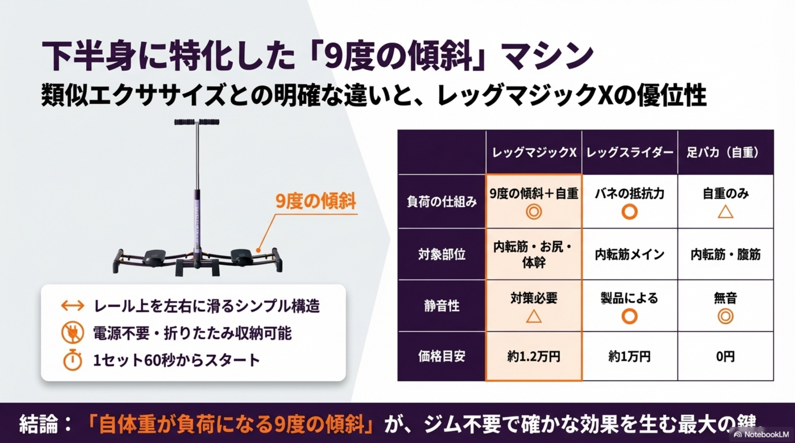 レッグマジック最大の特徴は9度の傾斜です。この傾斜によって自体重が負荷となり、単純なスライド動作でも太ももやお尻に効率的に負荷がかかります。足パカ(自重)で物足りないが、本格的なジムマシンは不要という層に適した製品です。