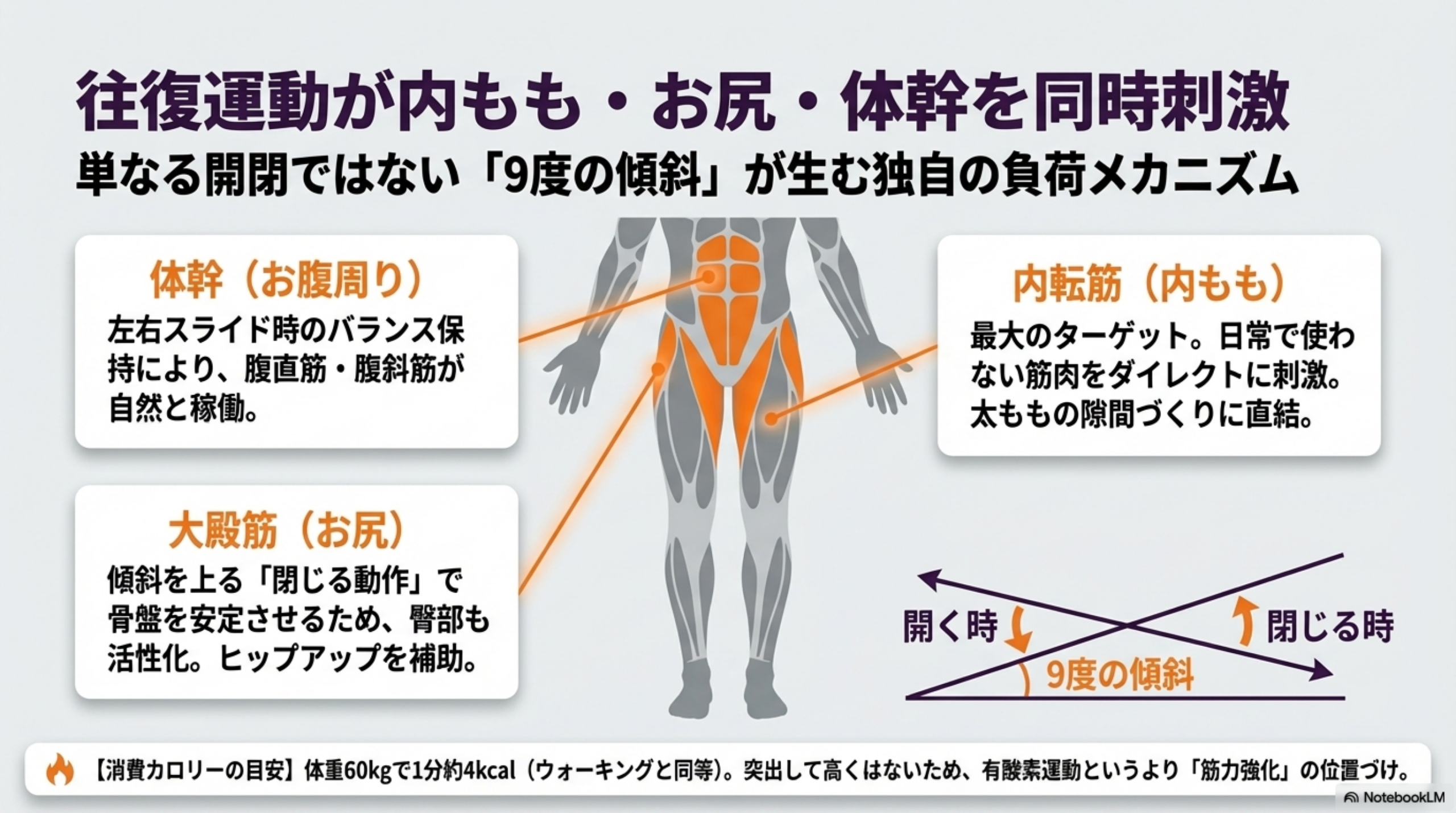 足を開くときは傾斜を下る方向に動くため、重力で勝手に開こうとする脚をコントロールする力が必要になります。逆に足を閉じるときは傾斜を上る方向に動くため、自体重を持ち上げる力が必要です。