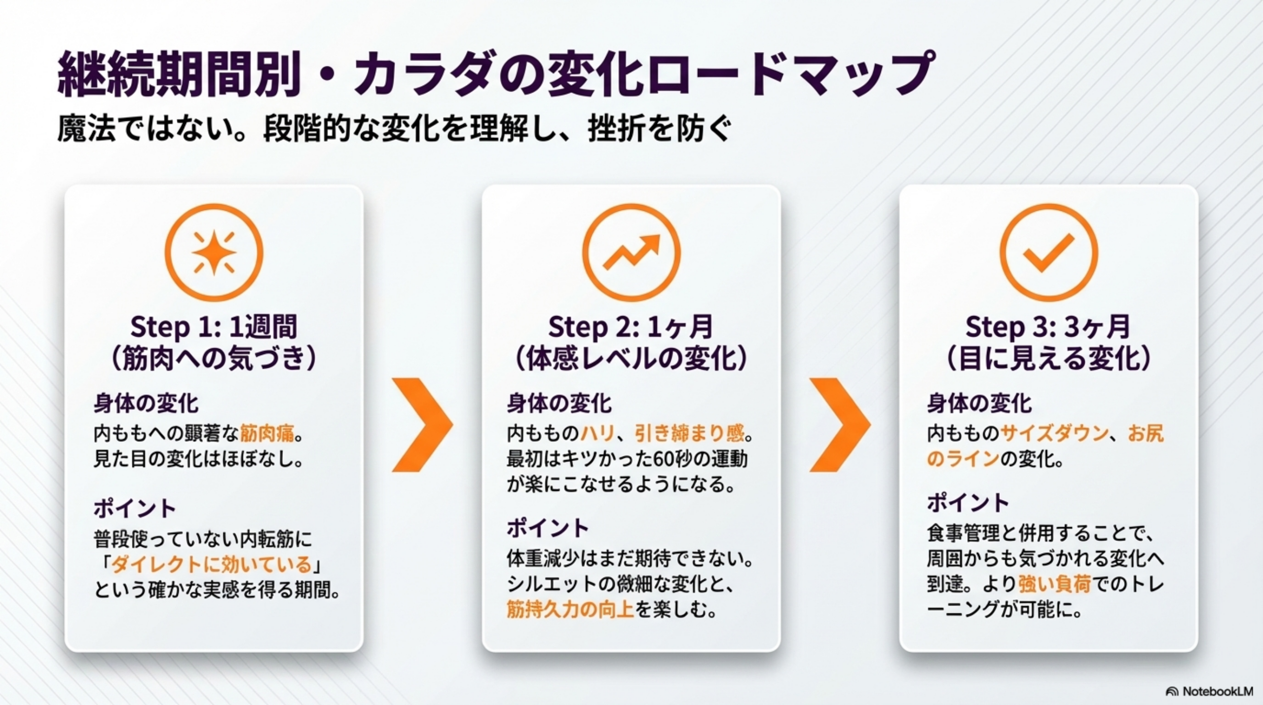 筋持久力が向上し、以前よりも強い負荷(速いスピード、長い時間)でトレーニングできるようになります。内もものサイズダウンや、お尻のラインの変化を周囲に指摘されるケースもあります。