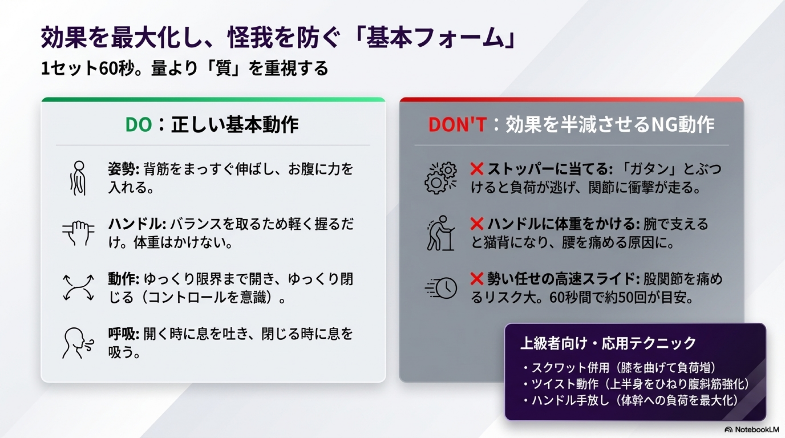 正しいフォーム(ストッパーに当てない、ハンドルに体重をかけない、1セット60秒を守る)を意識し、週3〜4回の継続から始めてみてください。効果を最大化するポイントは、無理をせず長く続けることです。