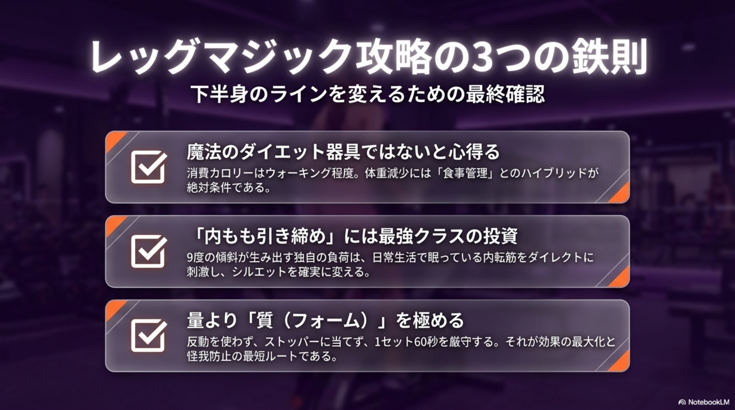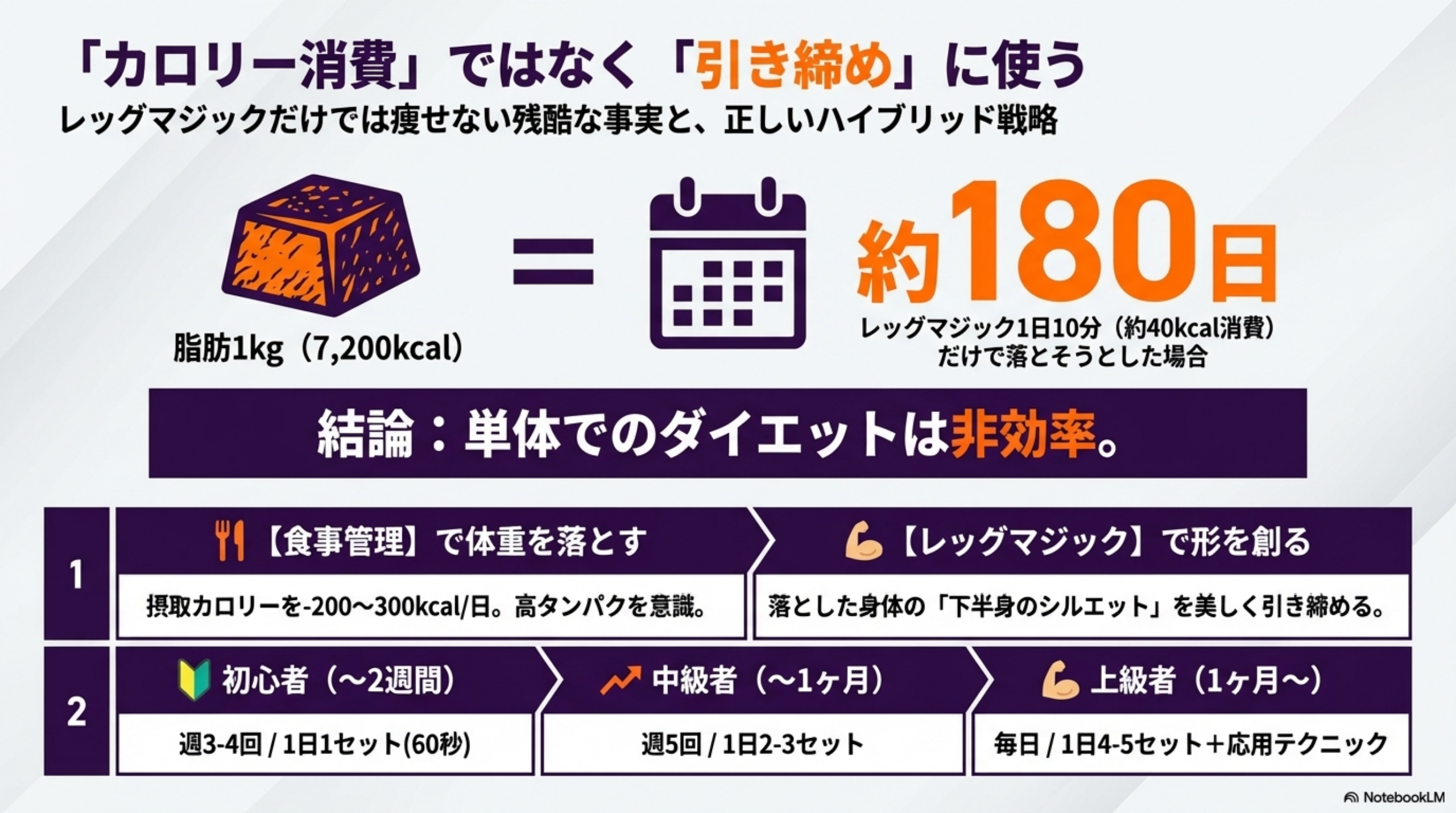 レッグマジック単体のカロリー消費に過度な期待を持たず、「食事で体重を管理し、レッグマジックで下半身を引き締める」という役割分担を明確にしましょう。
