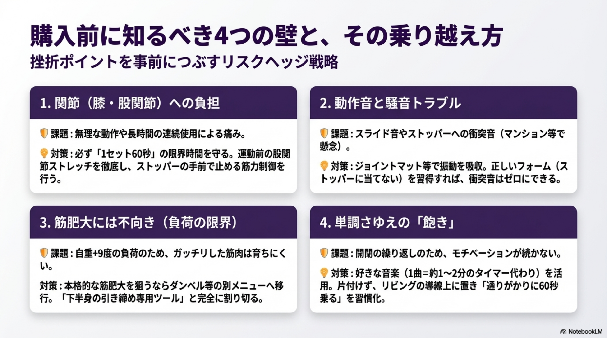 「手軽にできるものほど人はやらなくなる」——これはレッグマジックに限らず、すべての宅トレ器具に共通する課題です。導線上に置く(リビングの通り道など)ことで「通りがかりに乗る」習慣をつけるのが、実際の利用者から最も多く聞かれる継続のコツです。
