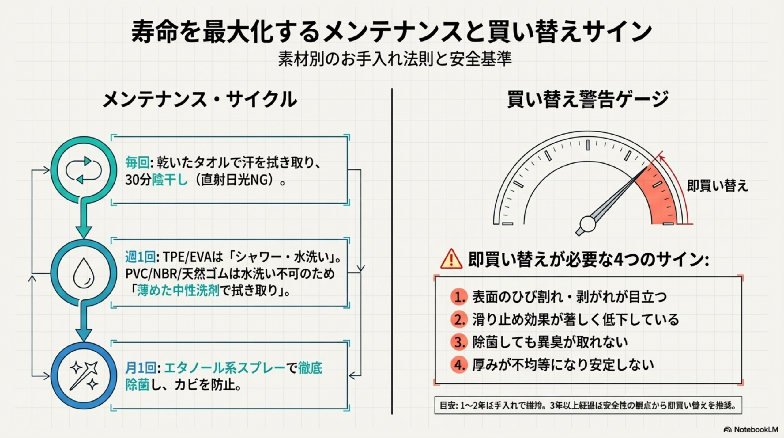 💡 長持ちさせるコツ: 使用後は必ず乾燥させる、直射日光での保管を避ける、2枚交互に使用して負担を分散させる、の3点を守るだけでマットの寿命は大幅に延びます。