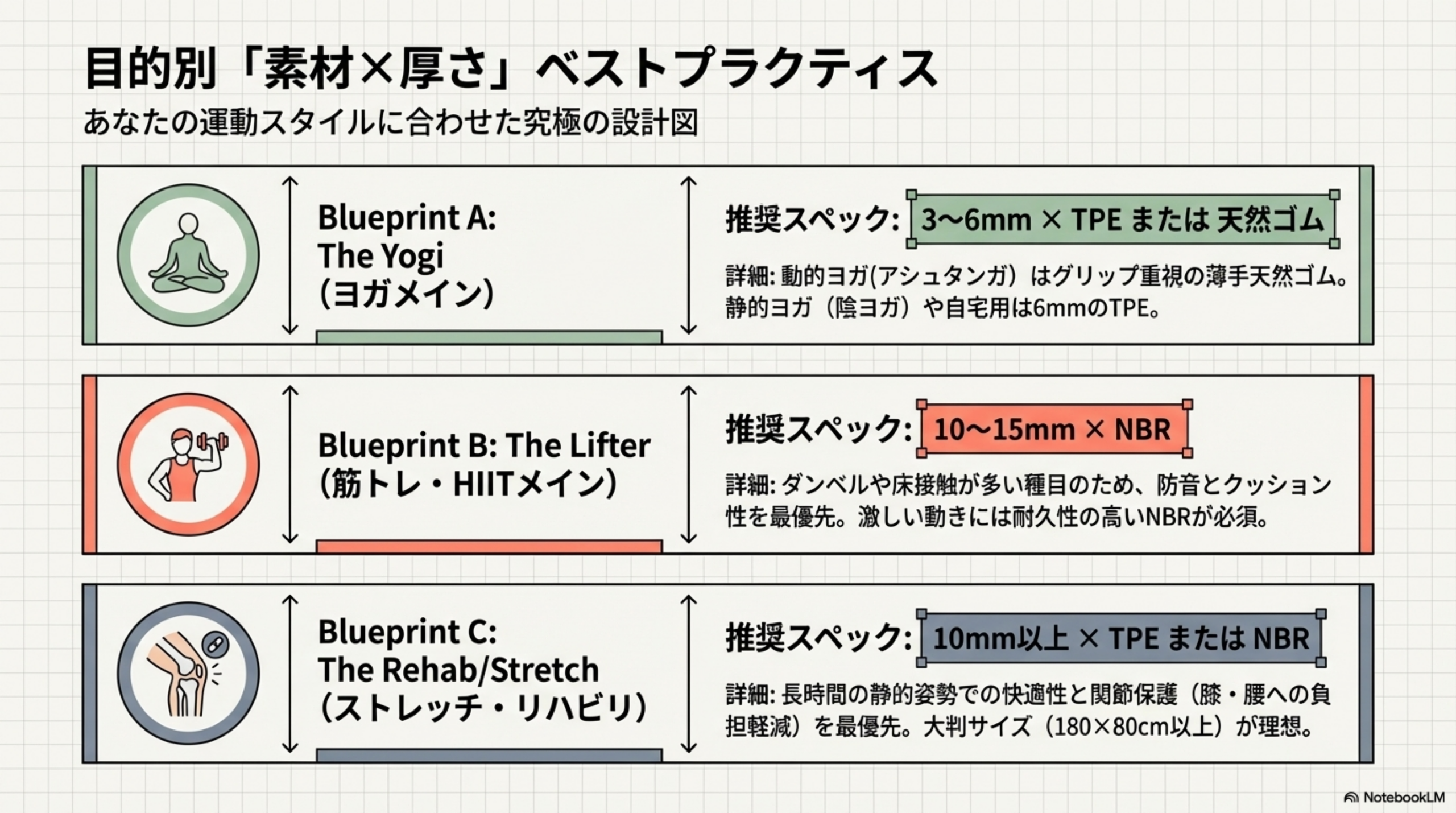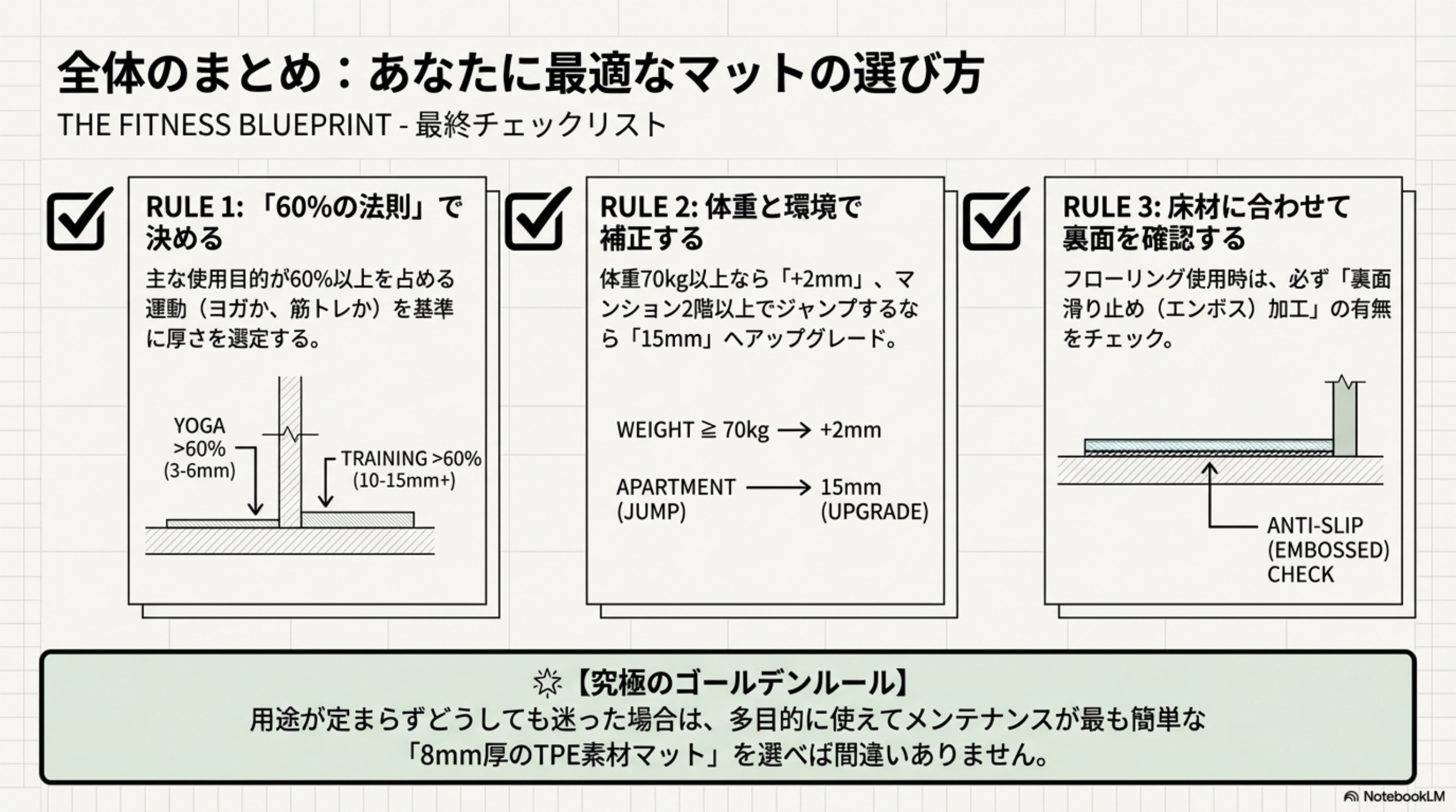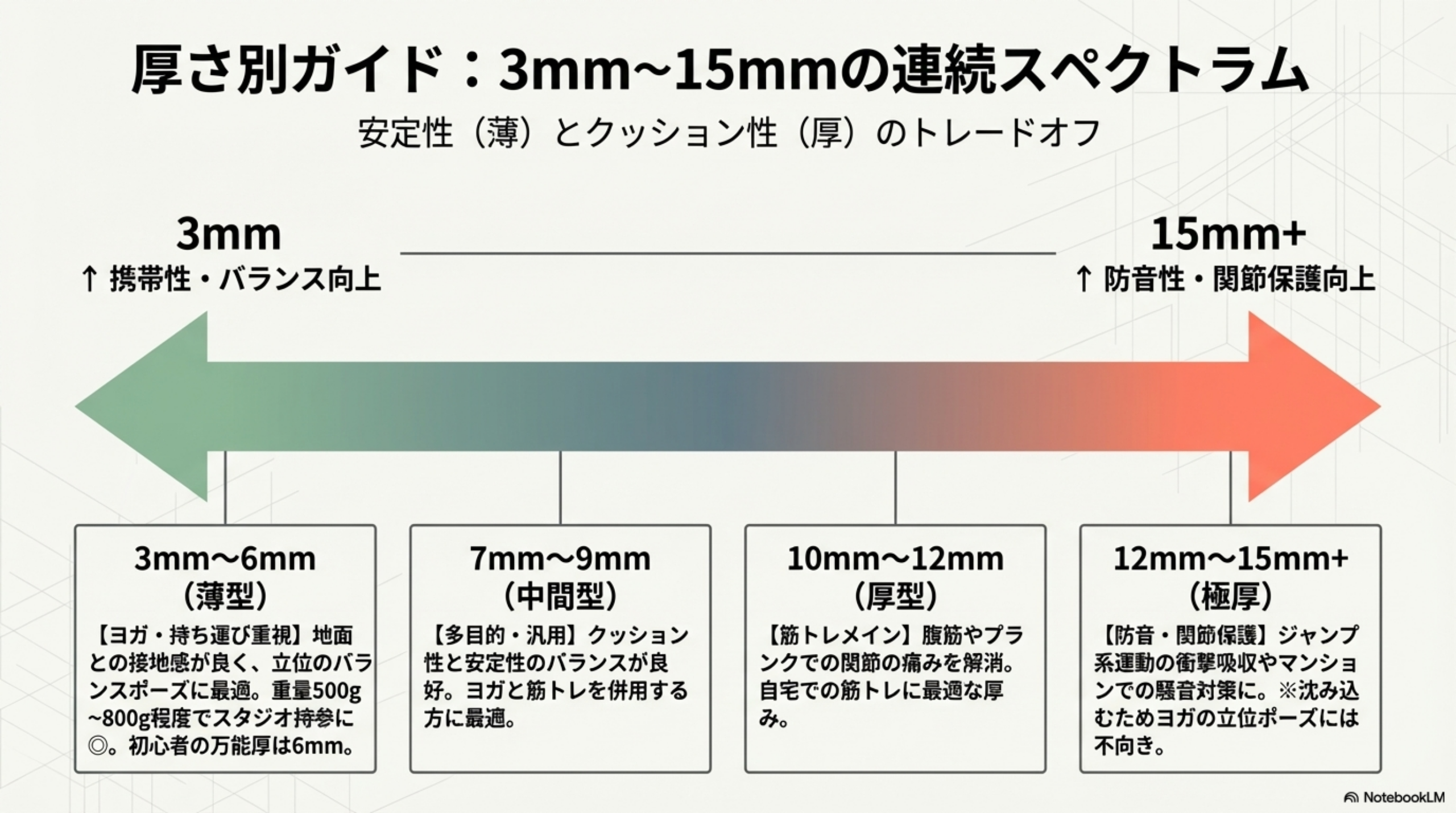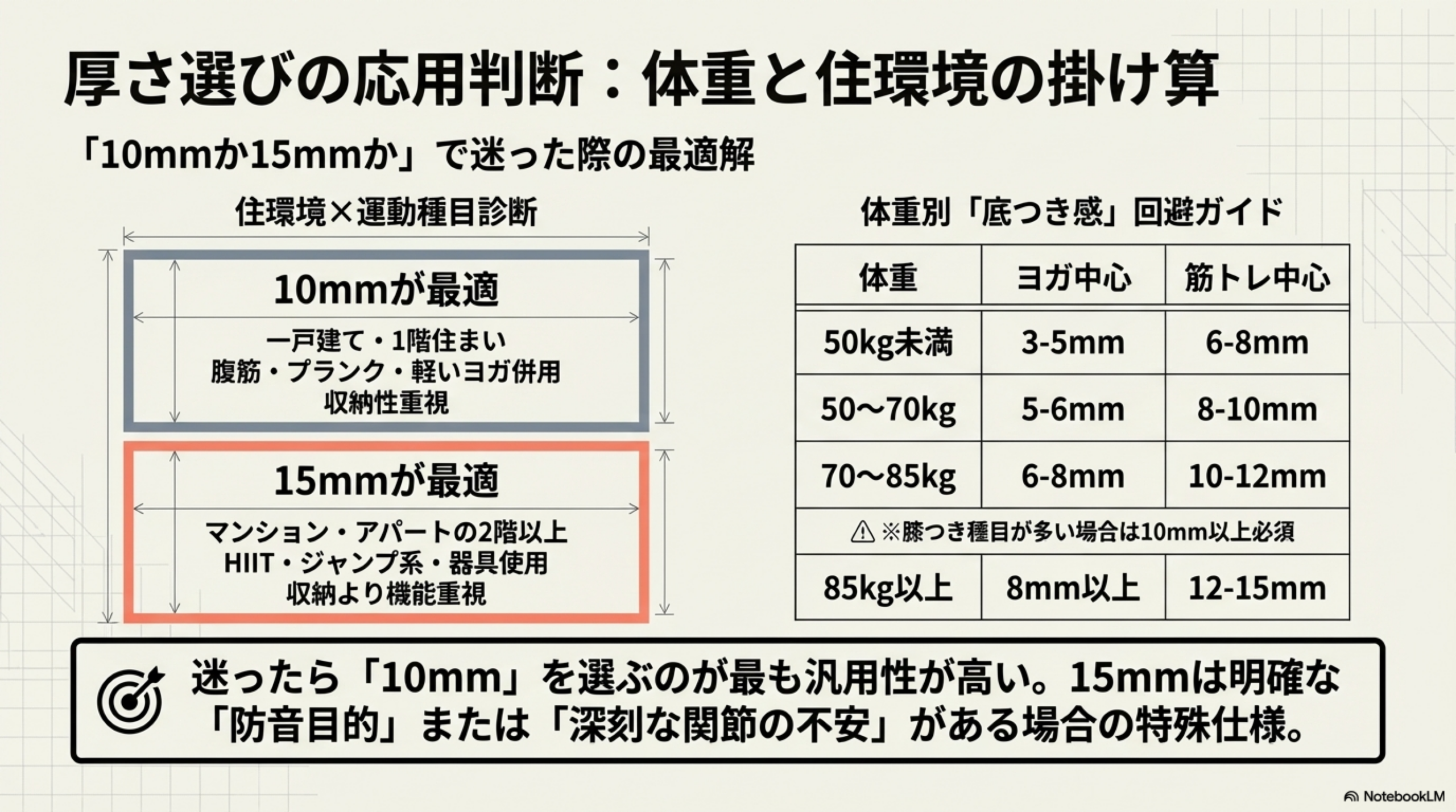 🎯 迷ったら10mmを選んでおけば多くの場面に対応できます。10mmは筋トレ・有酸素運動・軽いヨガまでカバーでき、収納性とクッション性のバランスが良好です。15mmが必要になるのは、明確に防音目的がある場合か、膝・腰に不安がある場合に限られます。
