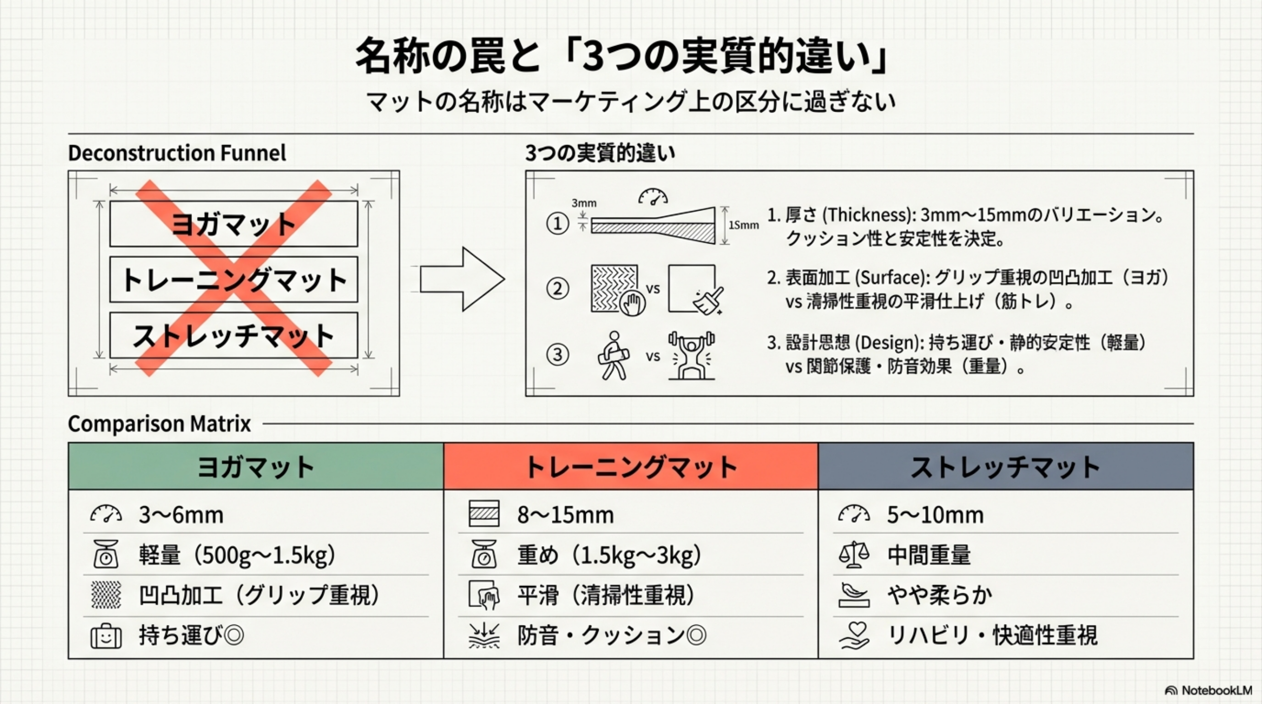 名称は違えど、マットの実質的な違いは厚さ・表面加工・設計思想の3つに集約されます。