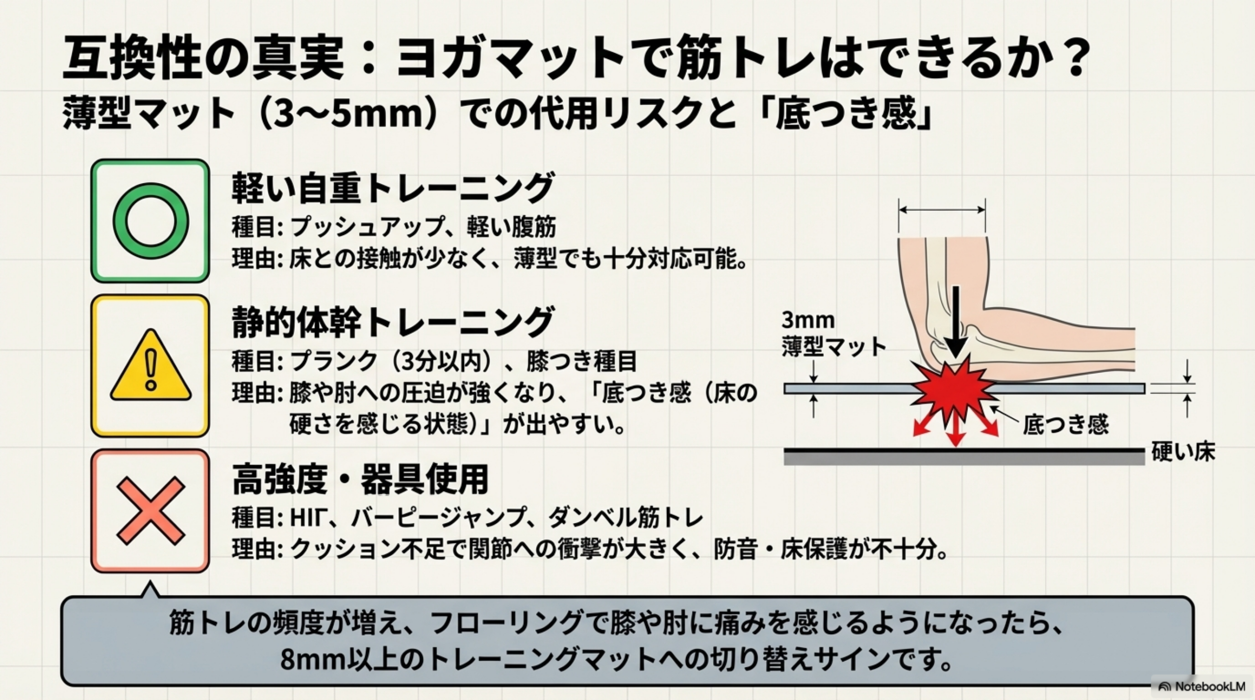 ⚠️ 膝をつく種目(クランチ、マウンテンクライマーなど)では、体重が一点に集中するため、特に底つき感が出やすくなります。体重が70kgを超える方は、膝つき種目を頻繁に行う場合、最低でも10mm以上の厚さを選ぶと快適にトレーニングできます。