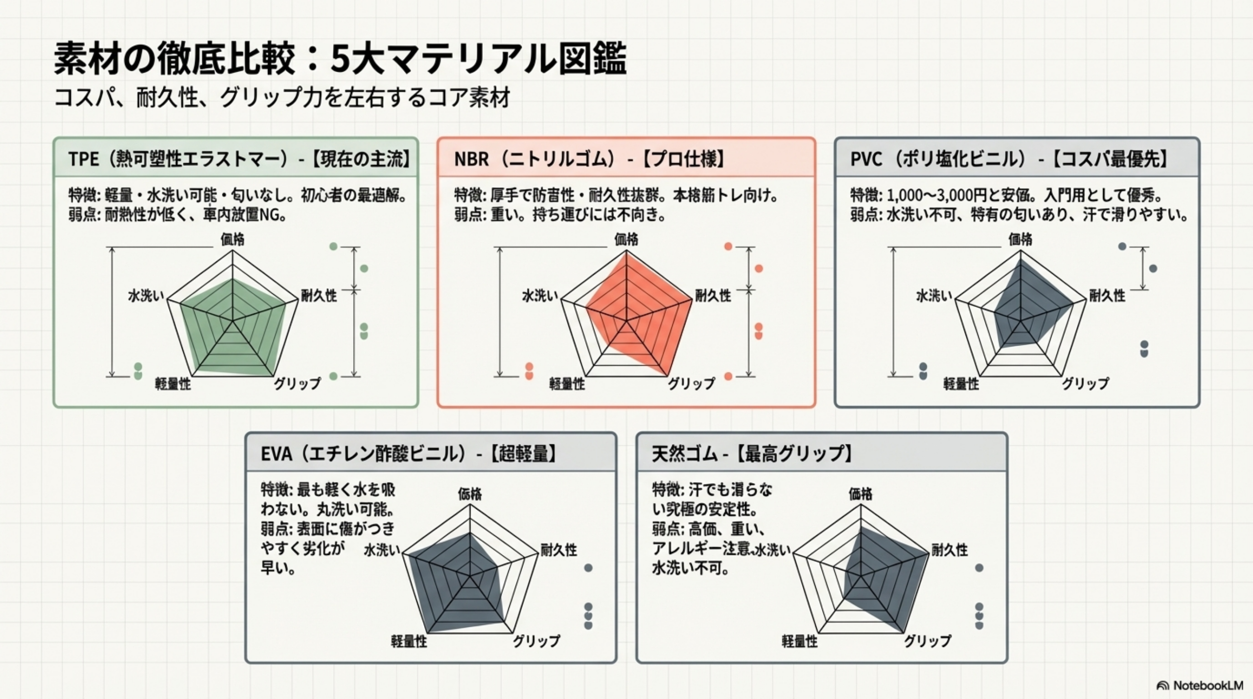 ヨガマット・トレーニングマット・ストレッチマットの特徴比較表