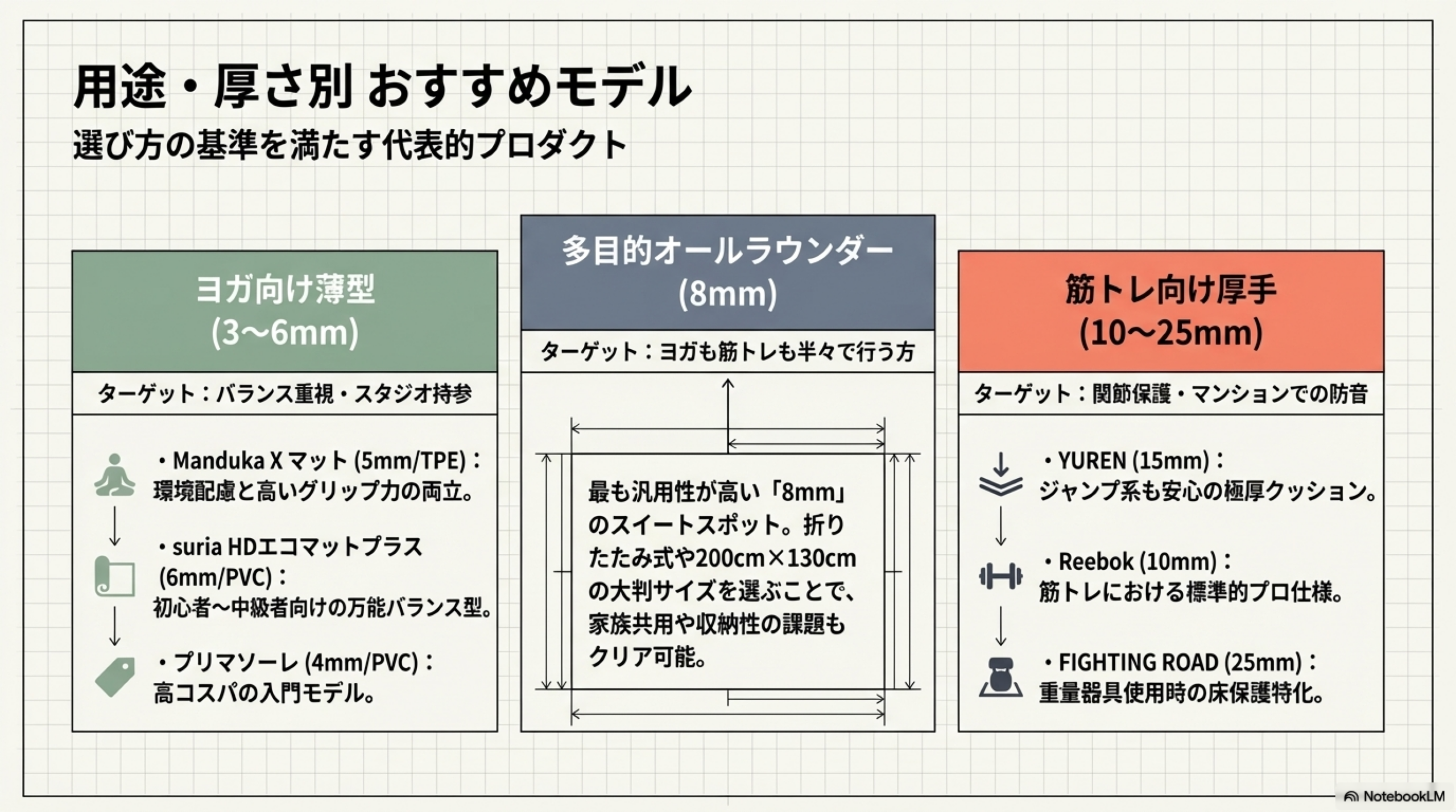 マット選びの最重要ポイントは厚さと用途のマッチングです。ここでは厚さ別に、実際に評価の高い製品を紹介します。