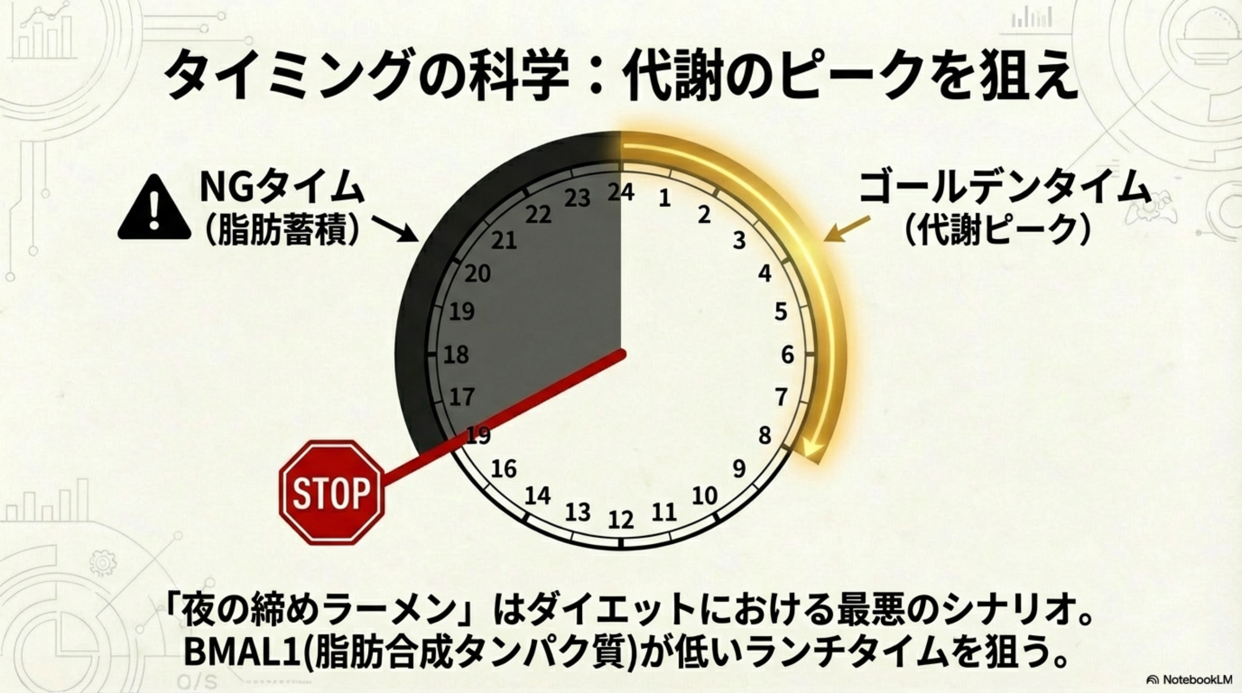 体内時計と代謝には密接な関係があり、ラーメンを食べる時間帯によってカロリー消費効率が大きく変わります。