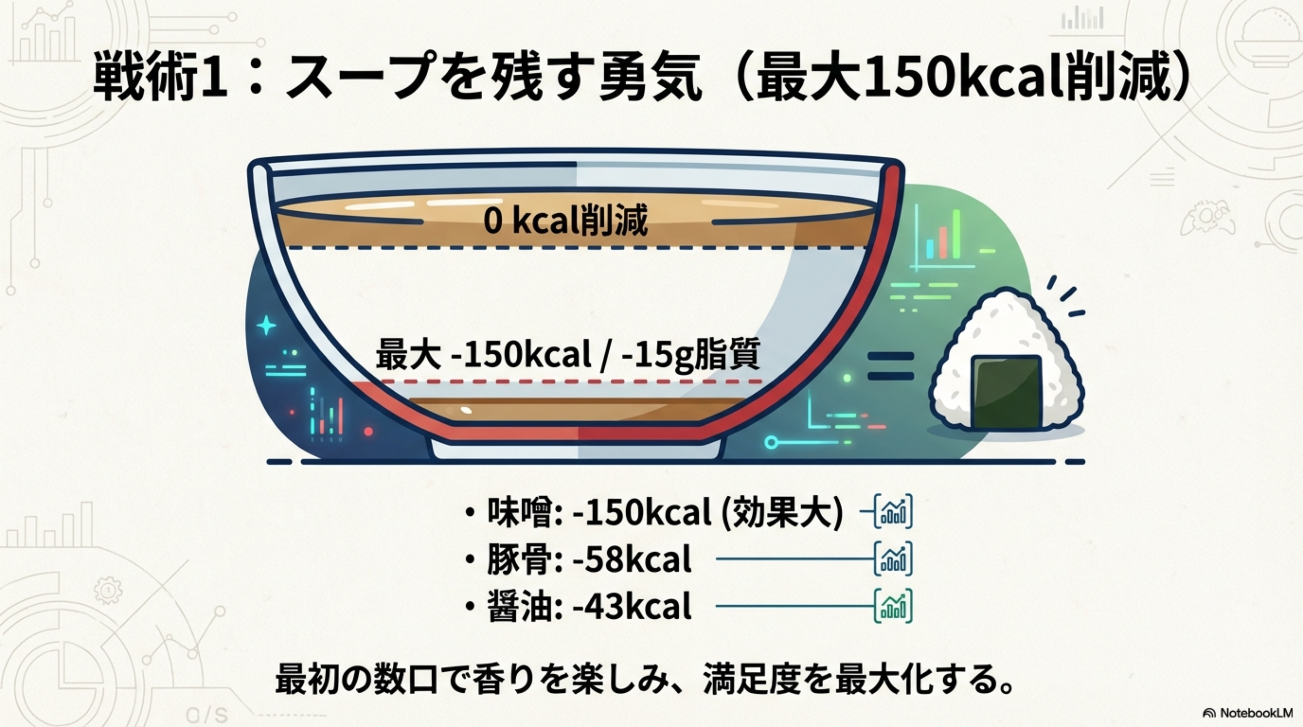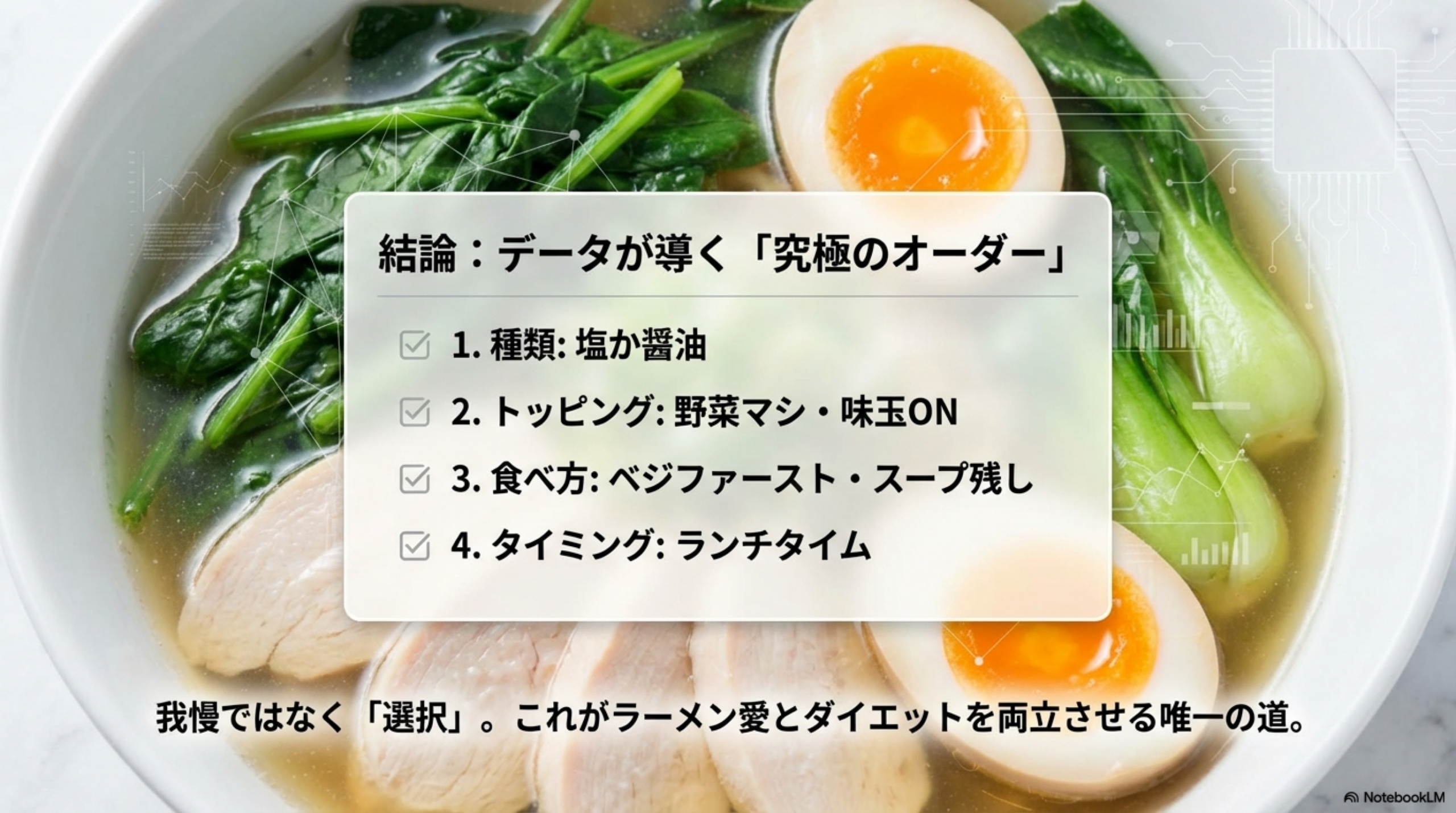 データに基づいた賢い選択こそが、ダイエット成功とラーメン愛を両立させる方法なのです。