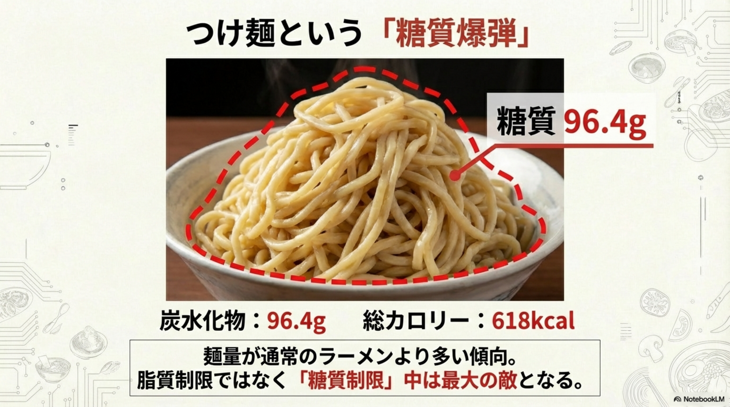 - つけ麺は麺量が多いため糖質が96.4gと非常に高い
