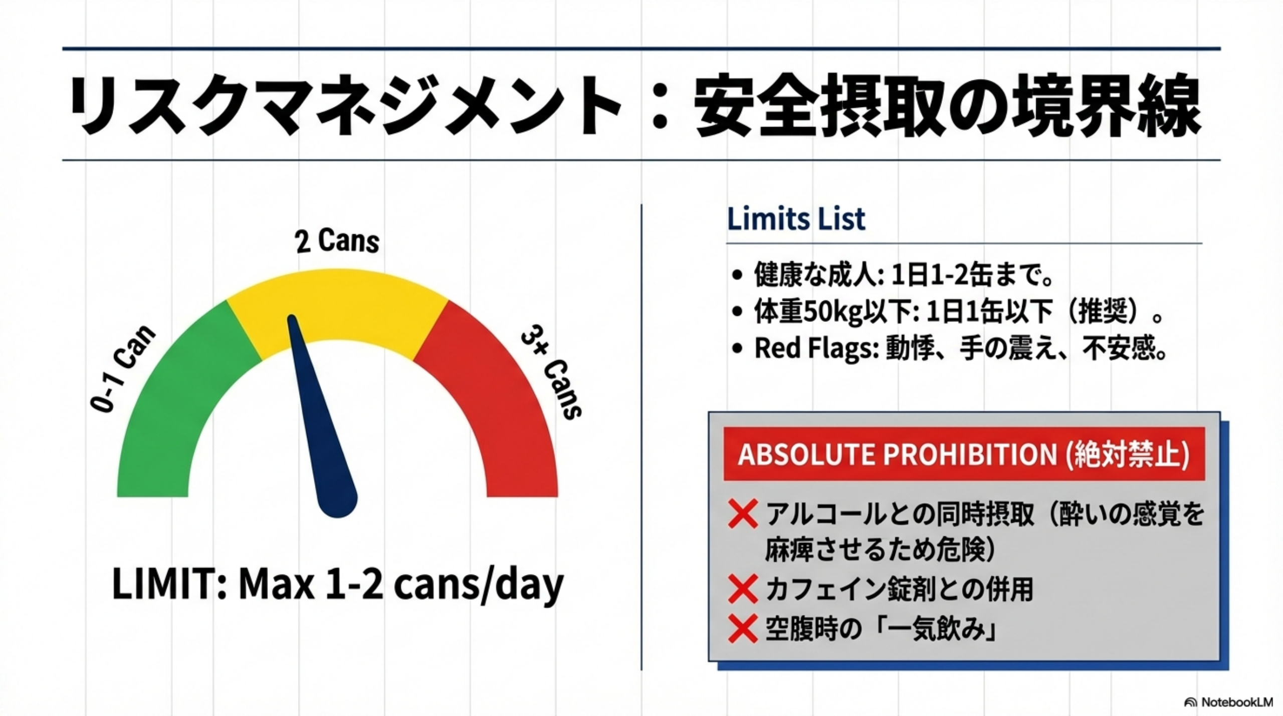 健康な成人で1-2本が目安ですが、日本人の体質を考慮するとより慎重な摂取が推奨されます。体重50kg以下の方は1日1本以下カフェイン敏感者は半分量から開始してください。妊婦・授乳婦・18歳未満の方は摂取を控えることが重要です。