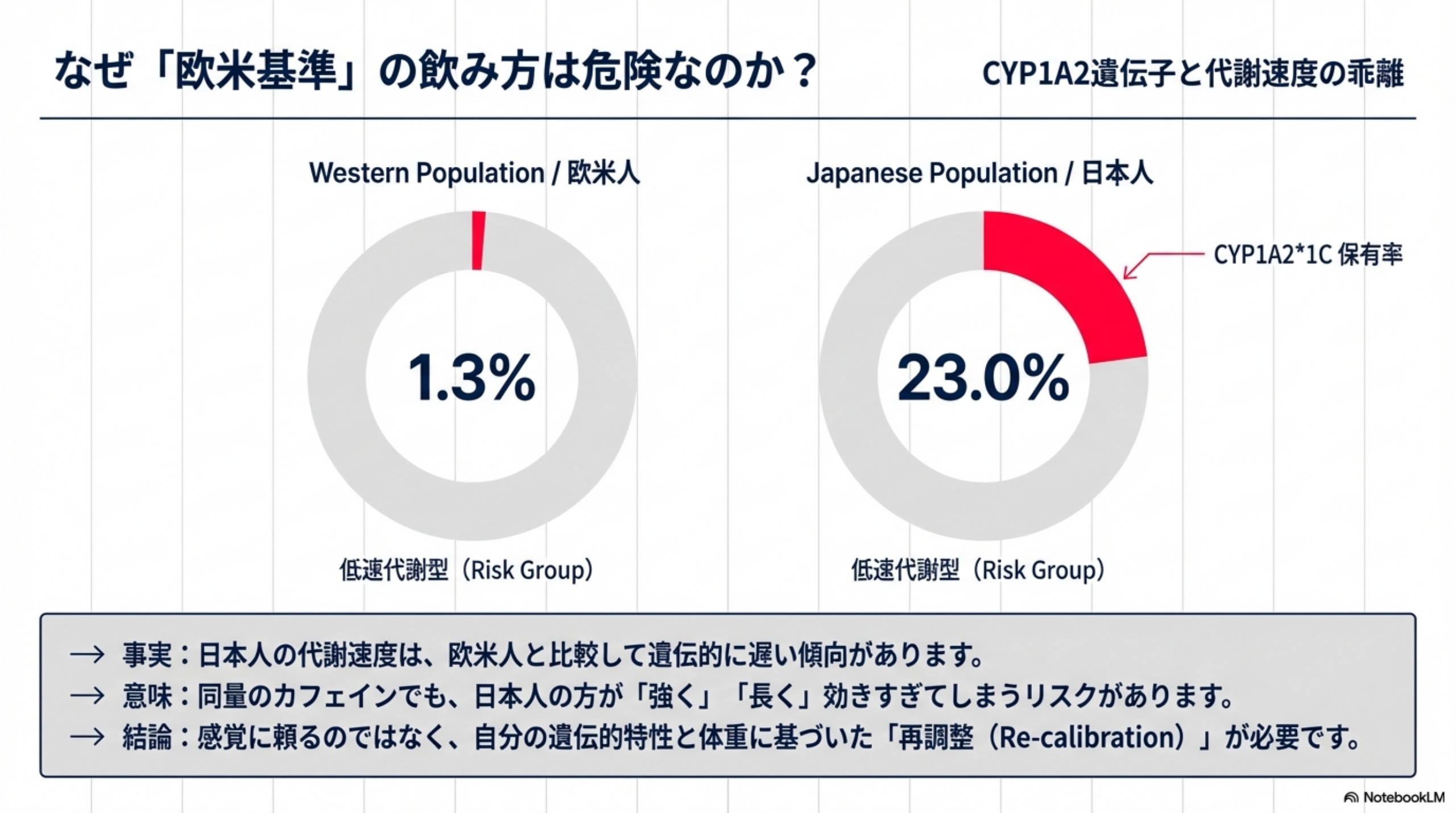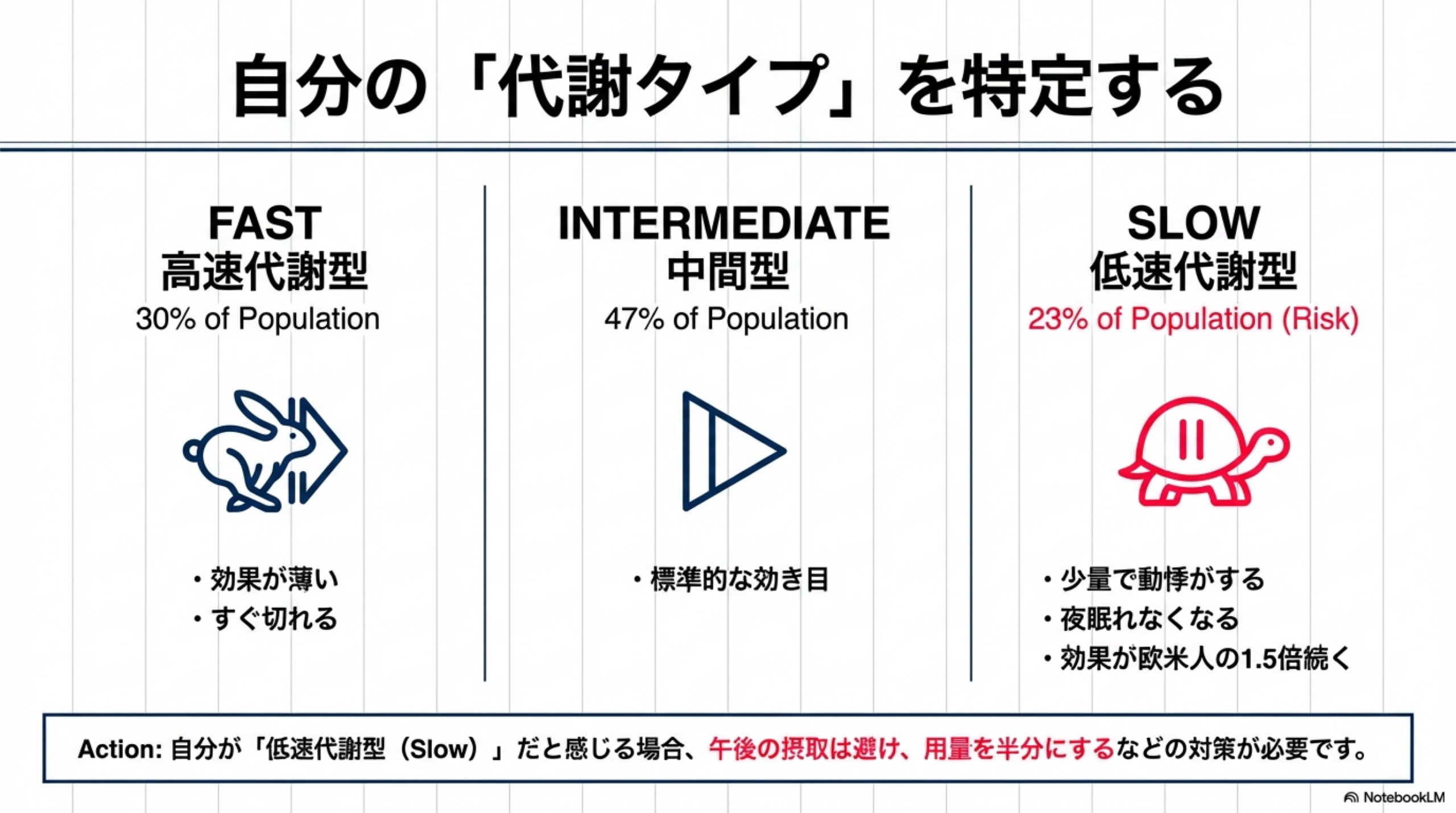 低速代謝型遺伝子を持つ日本人では、欧米人の1.5倍長く効果が持続するため、午後の摂取でも夜間の睡眠に影響する可能性があります。