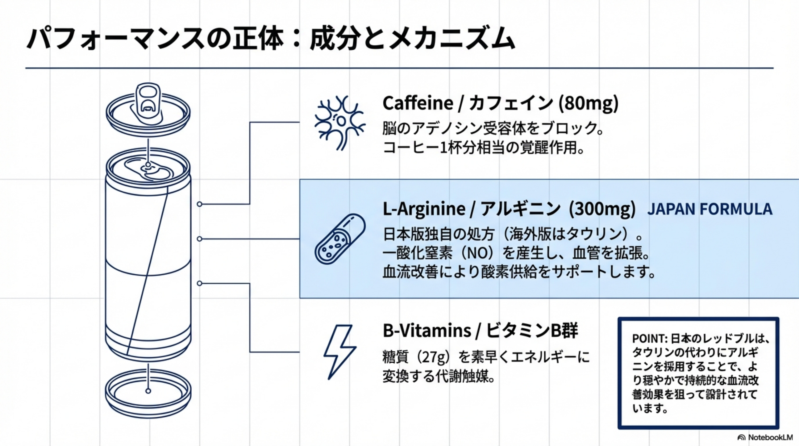 アルギニンによる血流改善効果が期待できますが、医薬品ではありません。日本版レッドブルに含まれる300mgのアルギニンは、一酸化窒素の産生を促進し、血管拡張作用をもたらす可能性があります。ただし、効果は個人差が大きく、過度な期待は禁物です。健康的なライフスタイルの一部として適度に活用することをお勧めします。