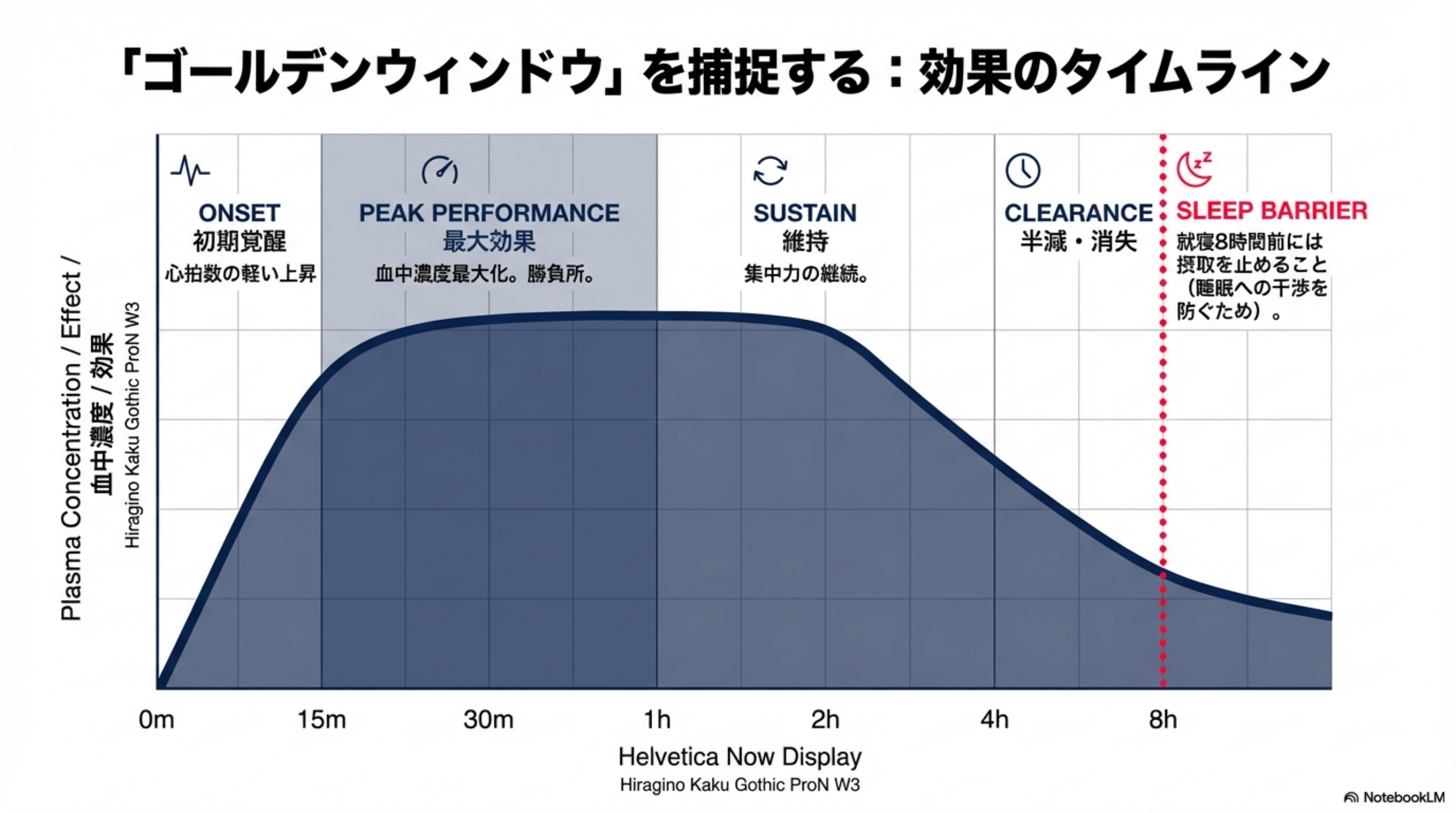 カフェインの血中濃度は摂取後30-60分でピークに達し、この時間帯に最大の効果を発揮します。