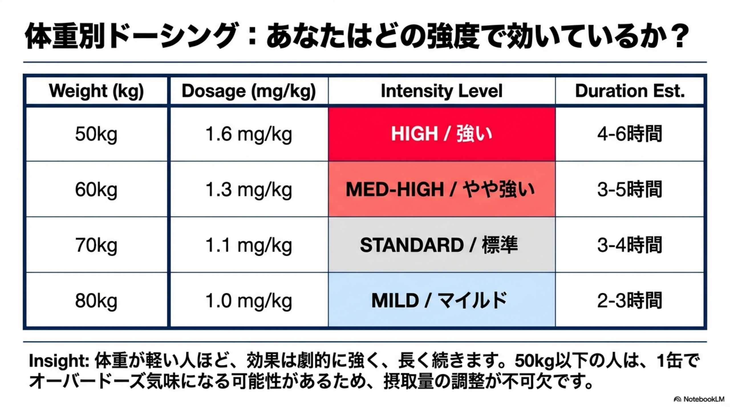 この表からも分かるように、体重が軽い人ほど強く長い効果を体験する傾向があり、摂取量の調整が重要です。