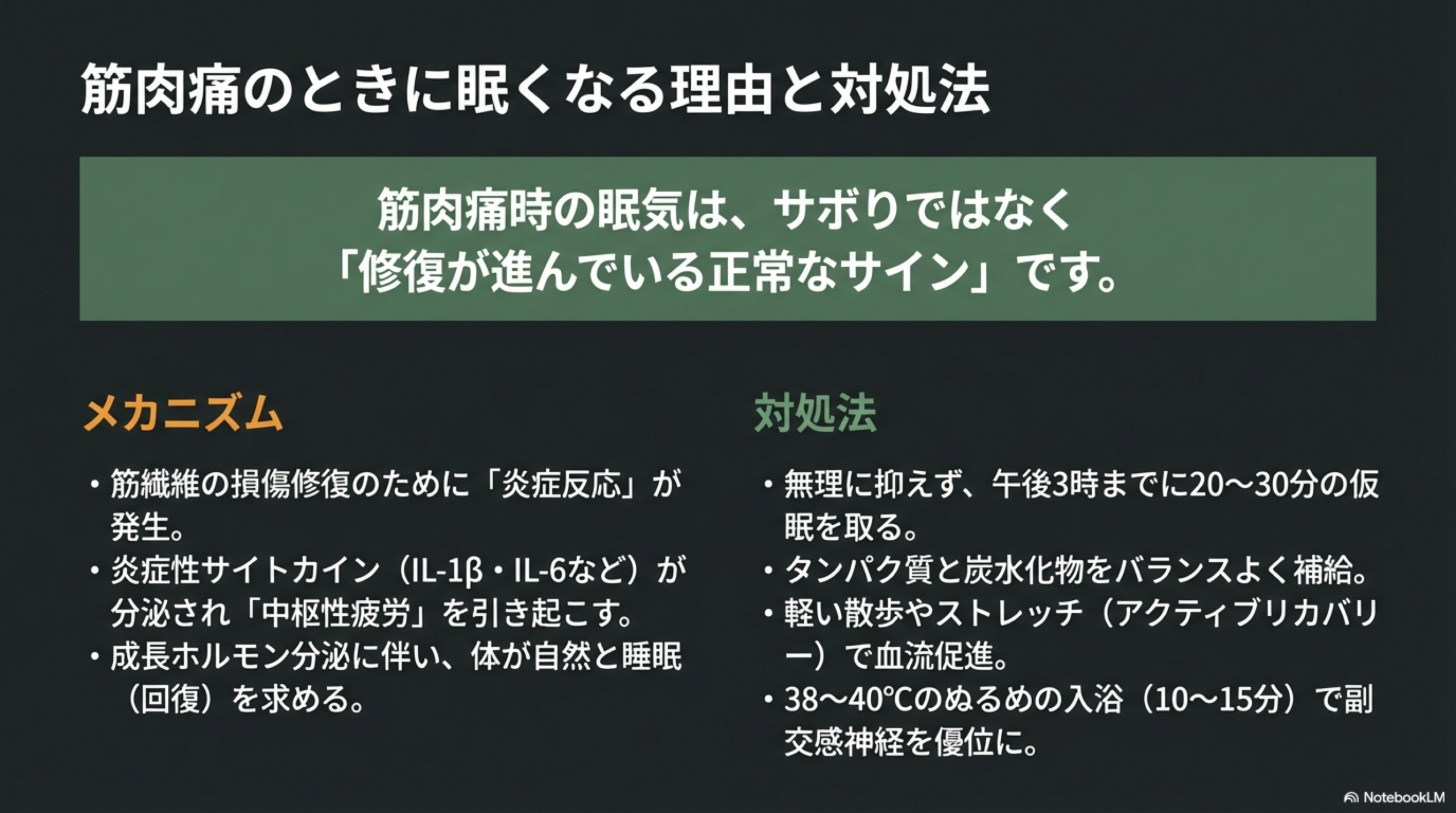 つまり筋肉痛時の眠気は、修復が進んでいるサインと考えることもできます。