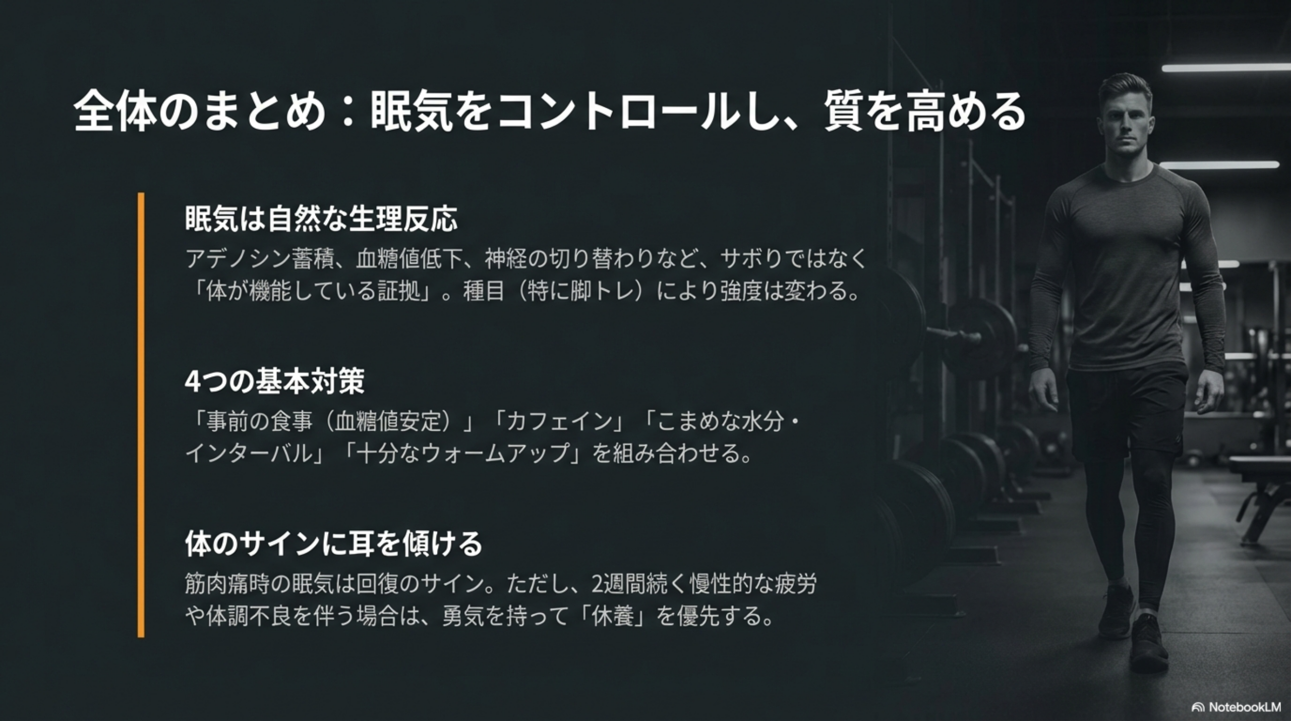 正しく対処すれば、眠気に振り回されることなくトレーニングの質を維持できます。眠気はコントロールできるものです。