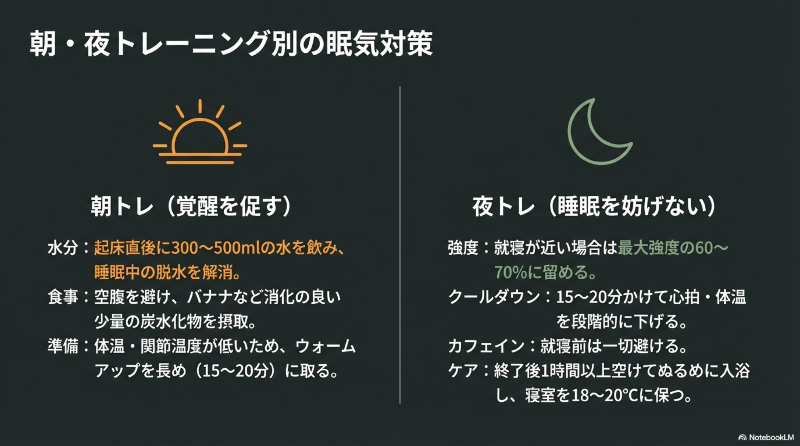🌙 夜トレの眠気・睡眠への影響を抑えるポイント: