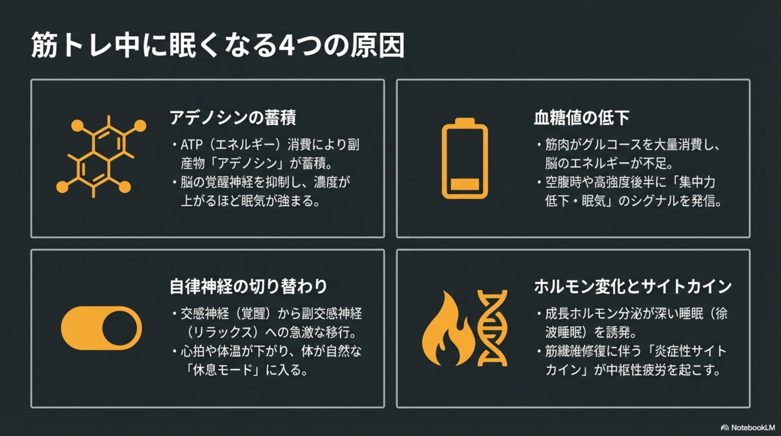 筋トレ中の眠気は、単一の原因ではなく複数の生理学的メカニズムが重なって発生します。主なものを4つに整理します。
