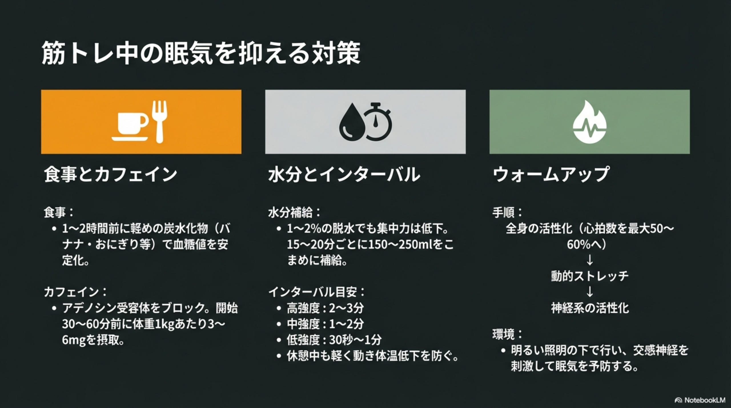対策の基本は「トレーニング前の食事(血糖値の安定)・カフェインの活用・こまめな水分補給・適切なウォームアップ」の4点です。筋肉痛や有酸素運動の眠気も、それぞれのメカニズムを理解すれば対処しやすくなります。