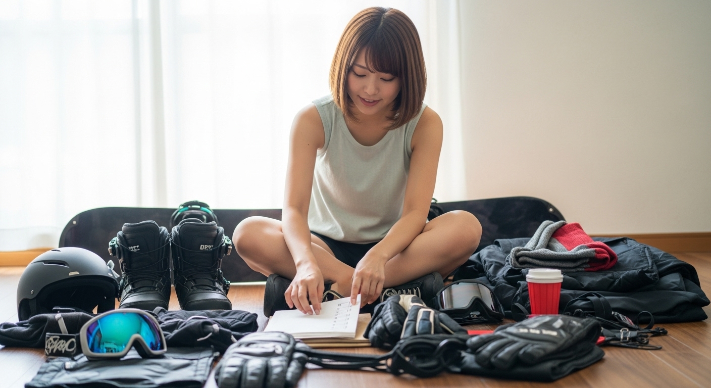 ボード・ブーツ・ビンディング・ウェア・グローブ・ゴーグル・ニット帽・リフト券入れの8点が絶対必要です。初回はボード・ブーツ・ビンディングをレンタルし、ウェアなどの身につけるものを購入するのが現実的です。
