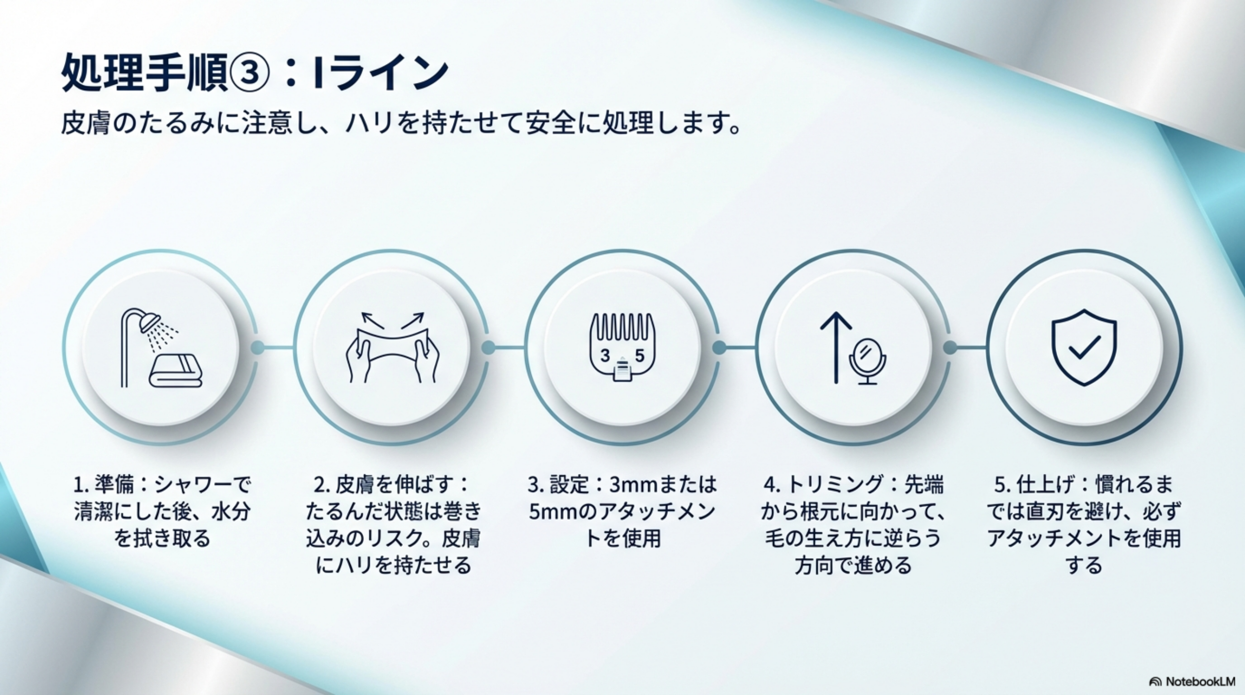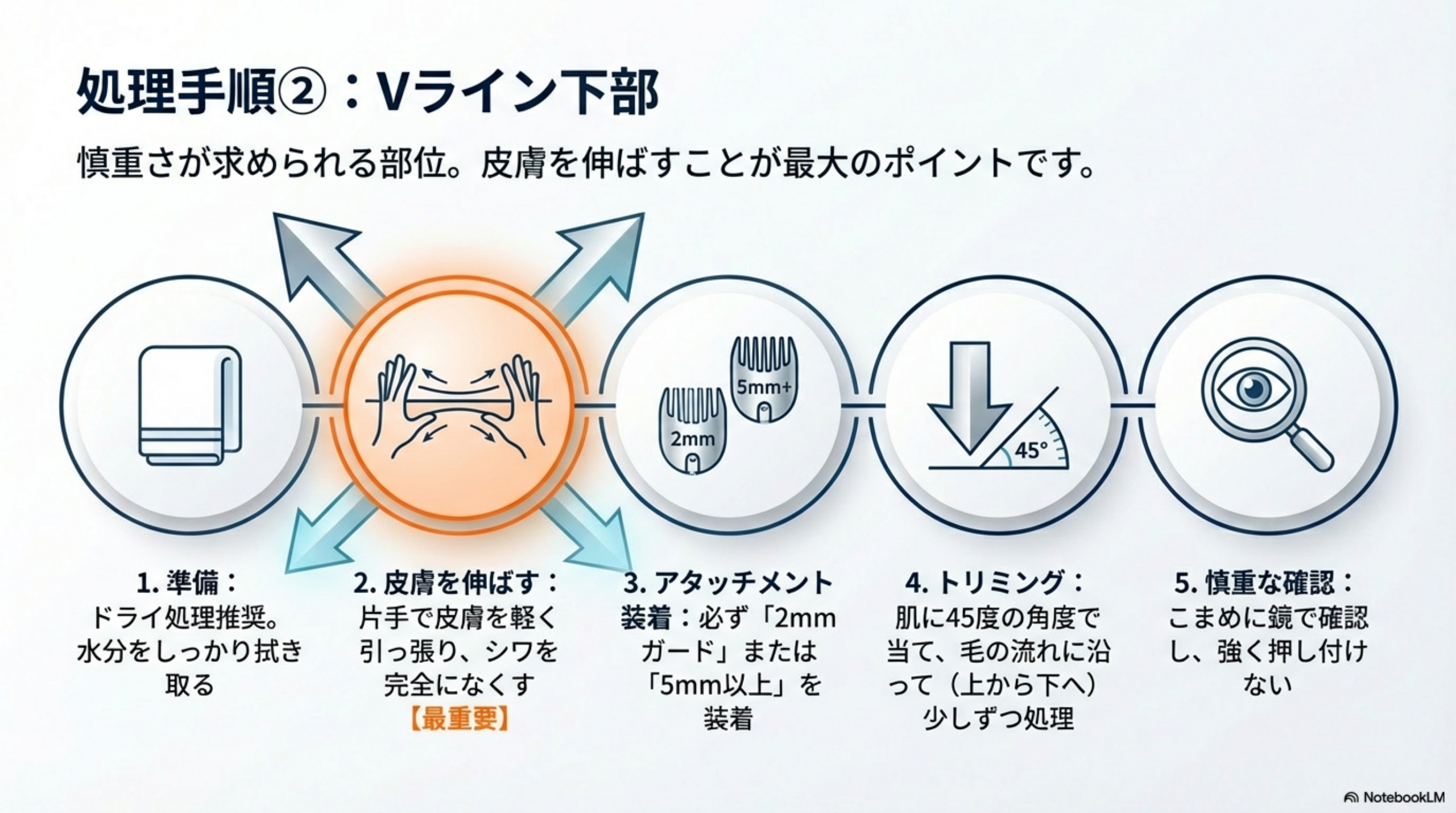 ボディトリマーを使った処理は難しくありませんが、部位ごとにコツがあります。以下の手順に沿って進めれば、初めてでも安全に処理できます。