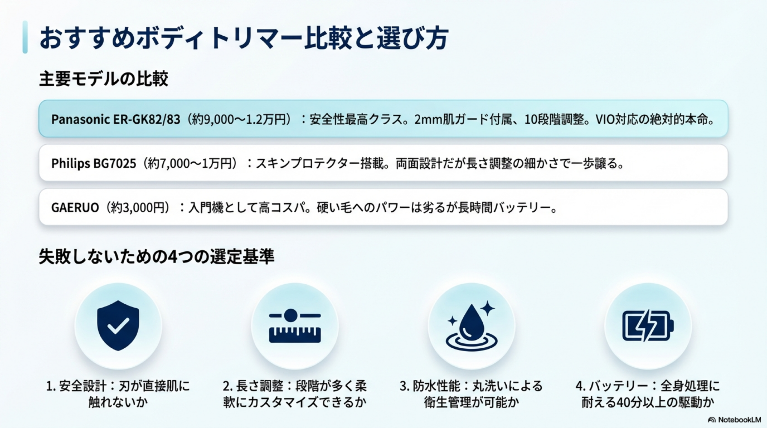 陰部の処理に適したボディトリマー・シェーバーを比較します。安全性と使いやすさを基準に、それぞれの特徴と適性をまとめました。