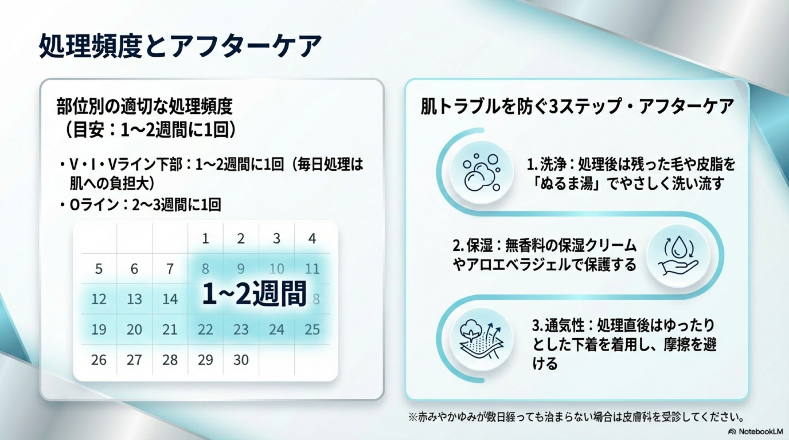 頻繁すぎる処理は肌への負担になります。毎日処理するのは避け、1〜2週間に1回のペースが肌と清潔感のバランスが取れます。汗をかきやすい夏場はやや頻度を上げるのもよいでしょう。