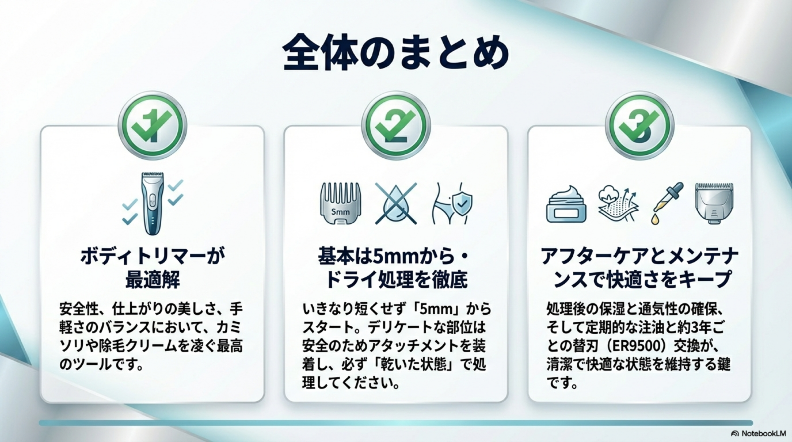 処理頻度は1〜2週間に1回を目安に、処理後は保湿と通気性の確保を忘れずに。替刃(ER9500)は約3年ごとに交換し、使用後の注油でコンディションを維持してください。一度習慣になれば、清潔で快適な状態を手軽にキープできるようになります。