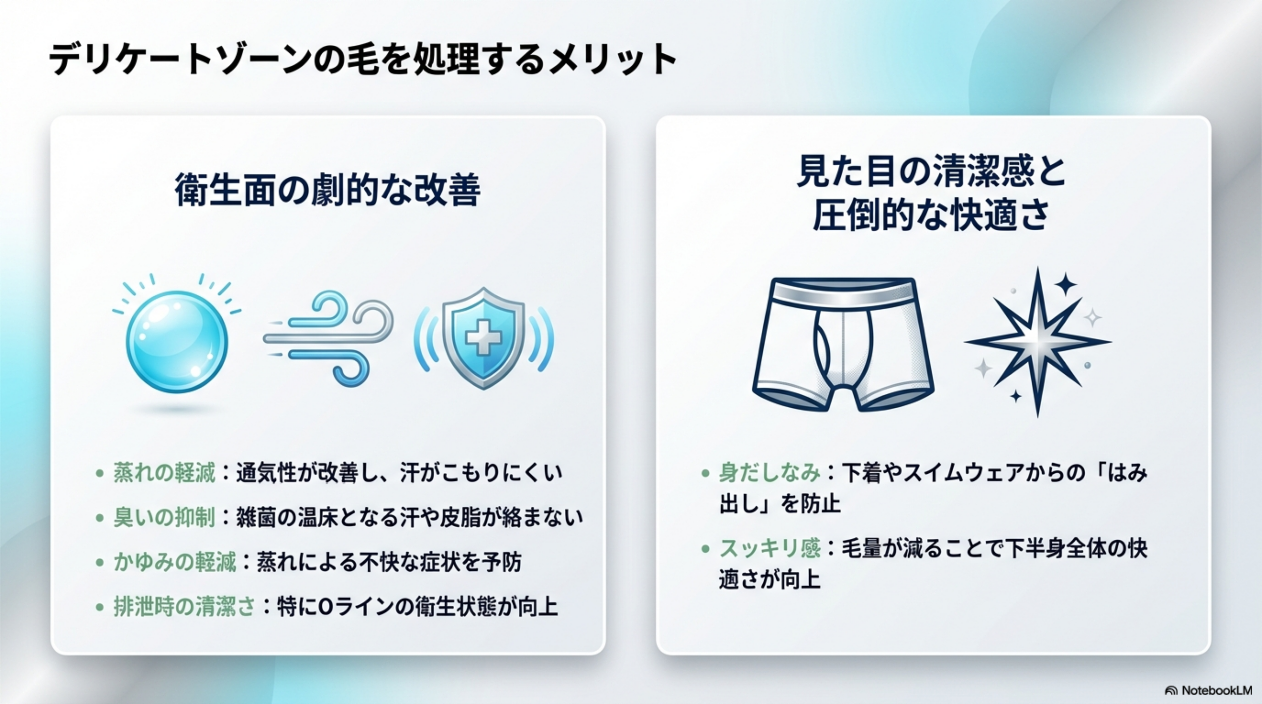 「そもそも陰部の毛を処理する必要があるのか?」と疑問に思う方もいるかもしれません。結論から言うと、衛生面・快適さの両面でメリットは大きいです。