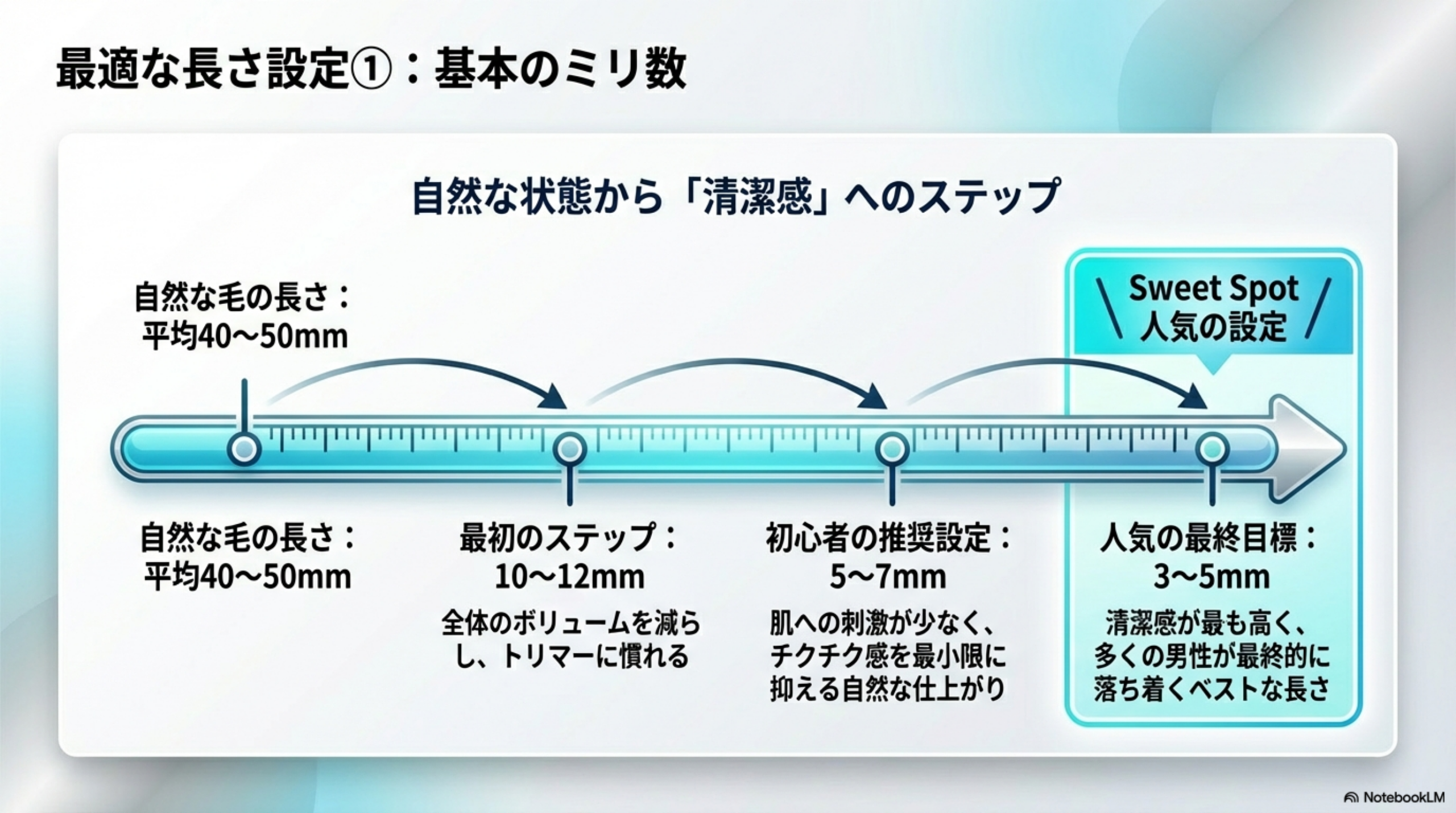 | 清潔感重視(人気の設定) | 3〜5mm | 整った印象で清潔感が高い。多くの男性が最終的に落ち着く長さ |