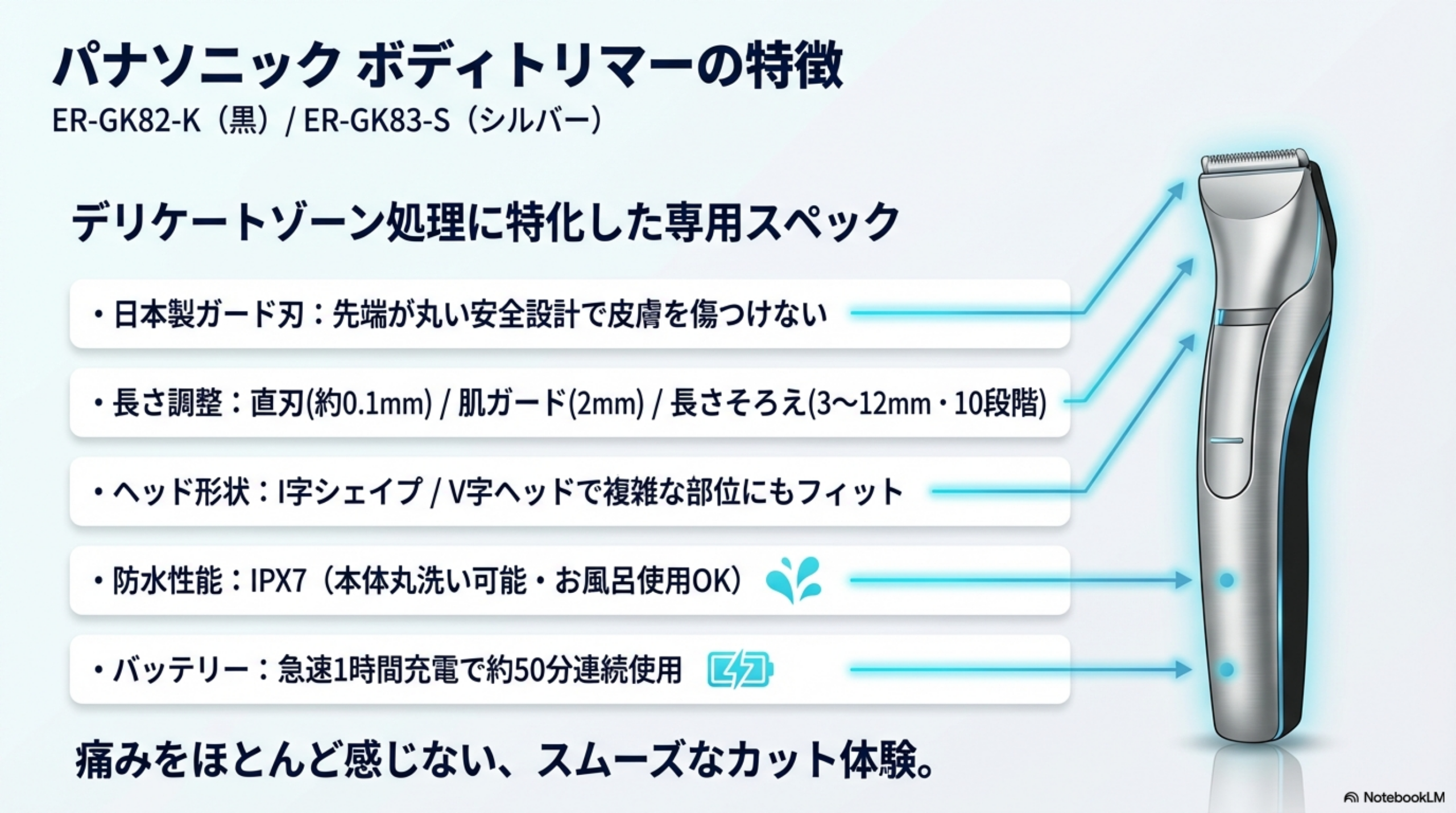 その原因は、陰部の処理に本当に適した道具と正しい手順が一つの記事にまとまっていないことにあります。本記事では、パナソニック ER-GK82を実際に使用したレビューと、製品スペックの正確な検証をもとに、処理するメリット・部位別の最適なミリ数・安全な手順・製品比較・替刃の交換時期まで網羅的に解説します。