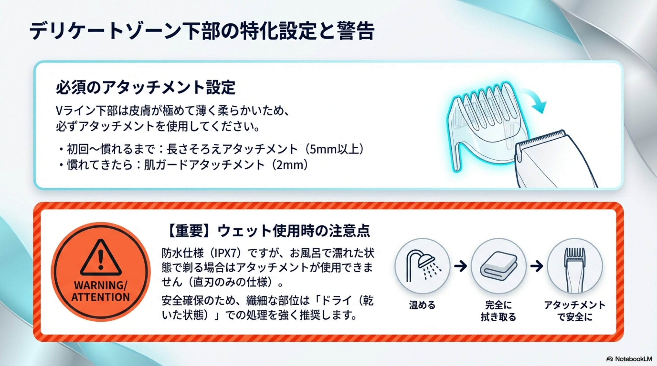 - 📌 アタッチメント装着:初回は5mm以上、慣れてきたら肌ガードアタッチメント(2mm)を使用。必ずアタッチメントを装着する