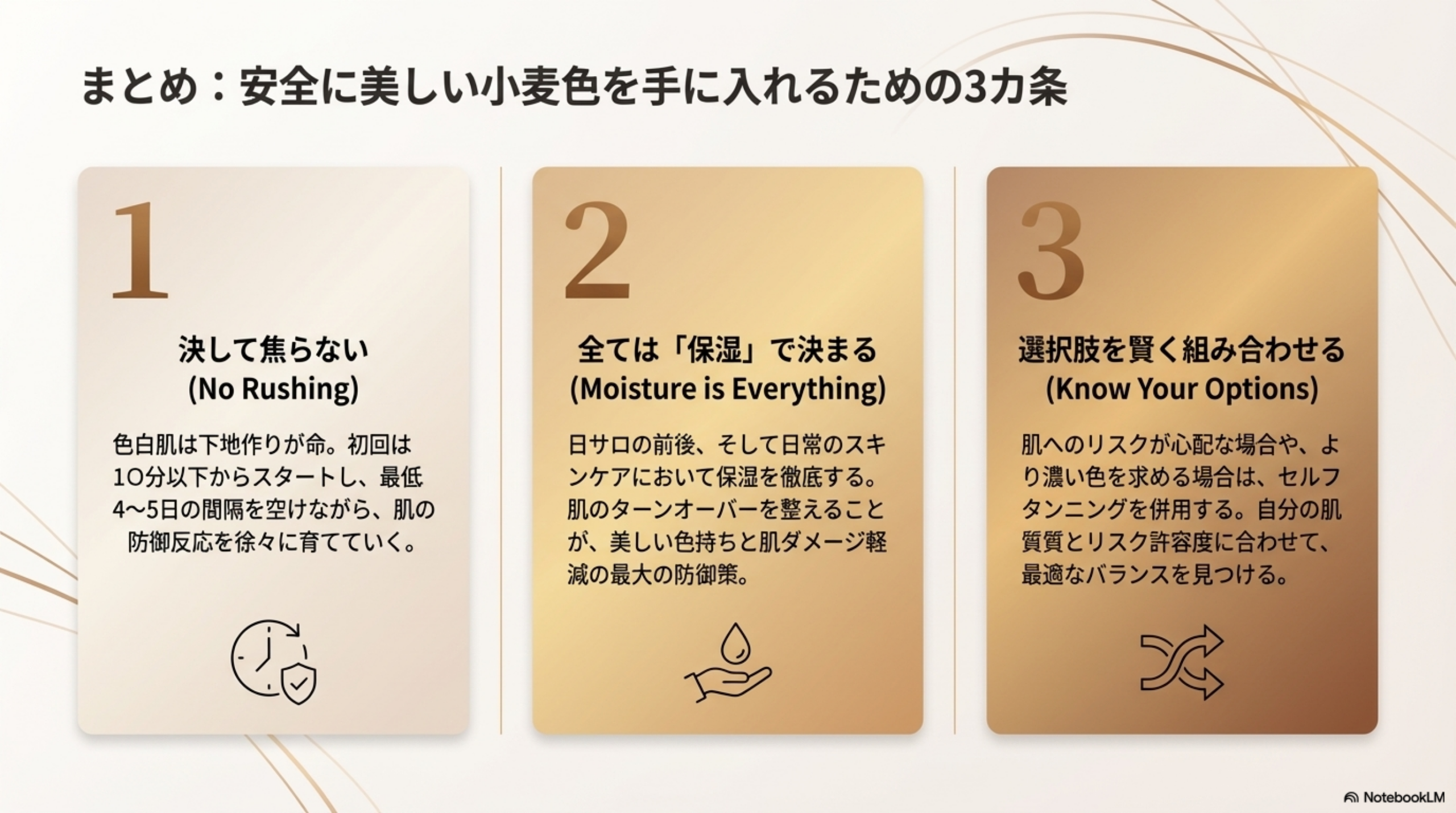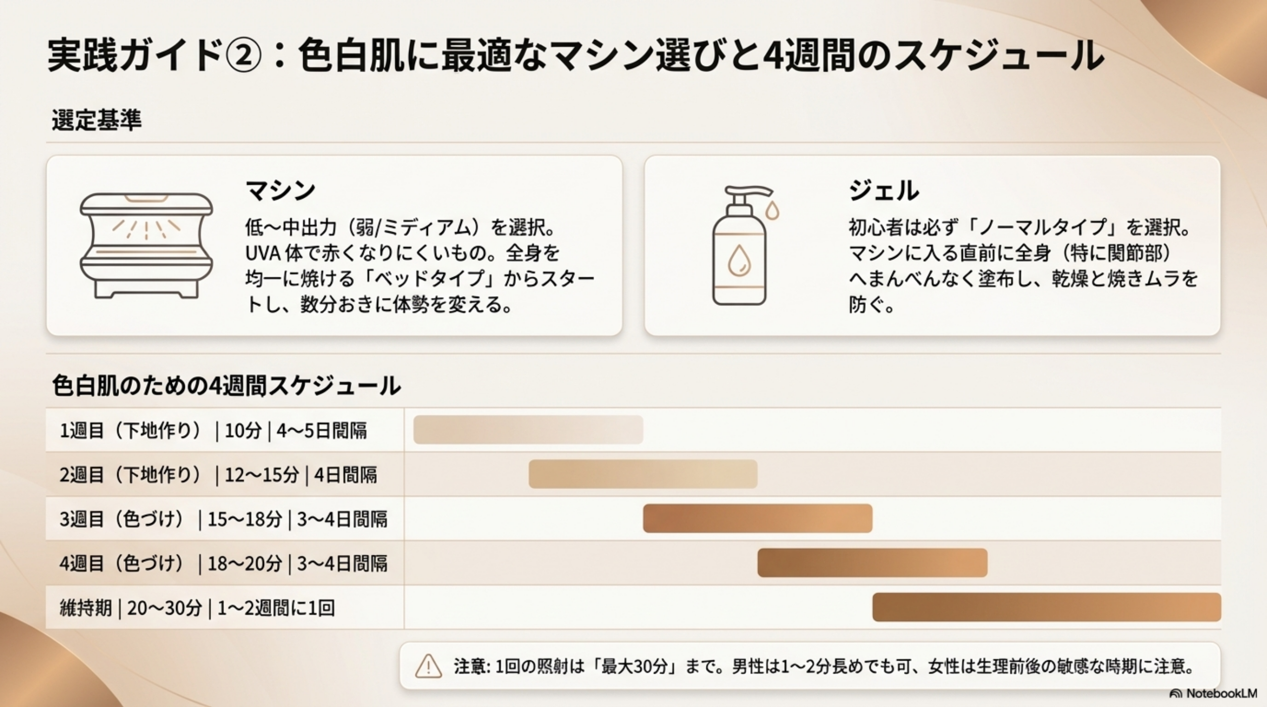 色白の方でも、適切な方法を取れば安全に小麦色の肌を手に入れることができます。最も大切なのは、焦らず段階的に進めることです。初回は10分以下の短時間から始め、4〜5日以上の間隔を空けながら、下地作りから丁寧に進めましょう。