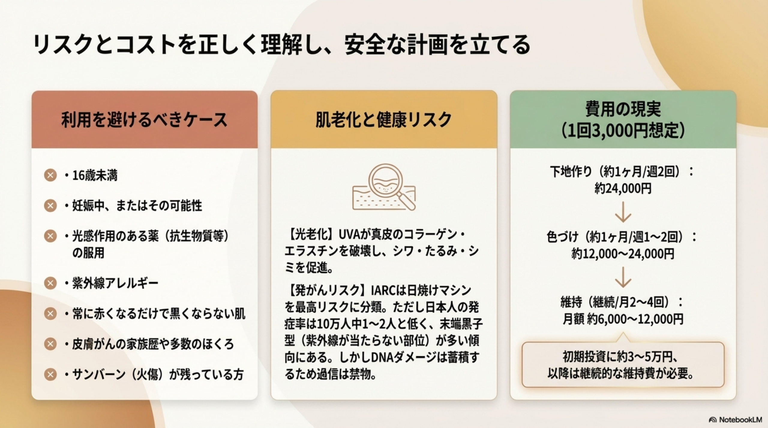 リスクをゼロにすることはできませんが、適切な頻度と時間を守り、アフターケアを徹底することでリスクを低減することは可能です。「知った上で使う」のと「知らずに使う」のでは結果が大きく違います。