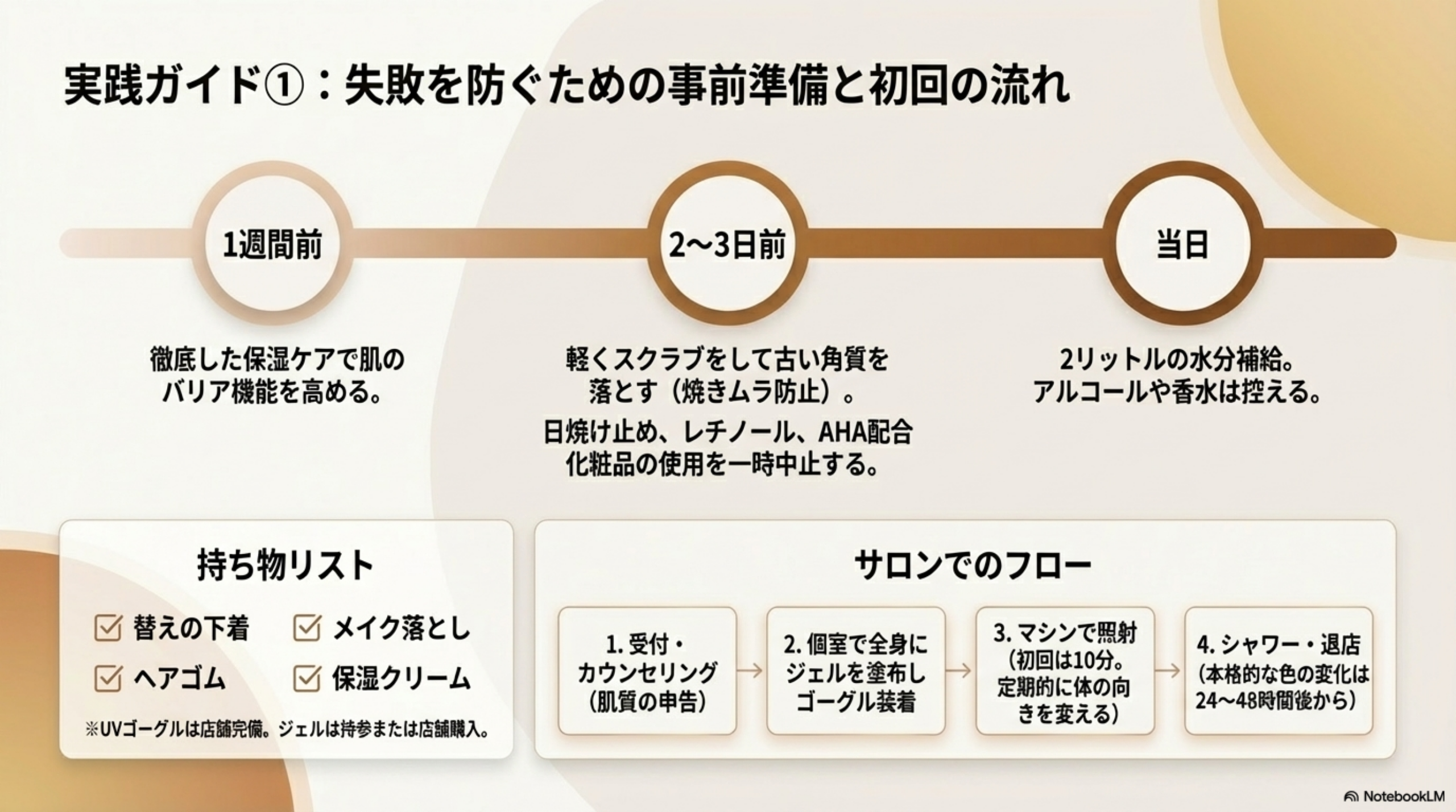 - 角質ケア:日サロの2〜3日前に軽くスクラブで古い角質を落とす(均一な日焼けのため)