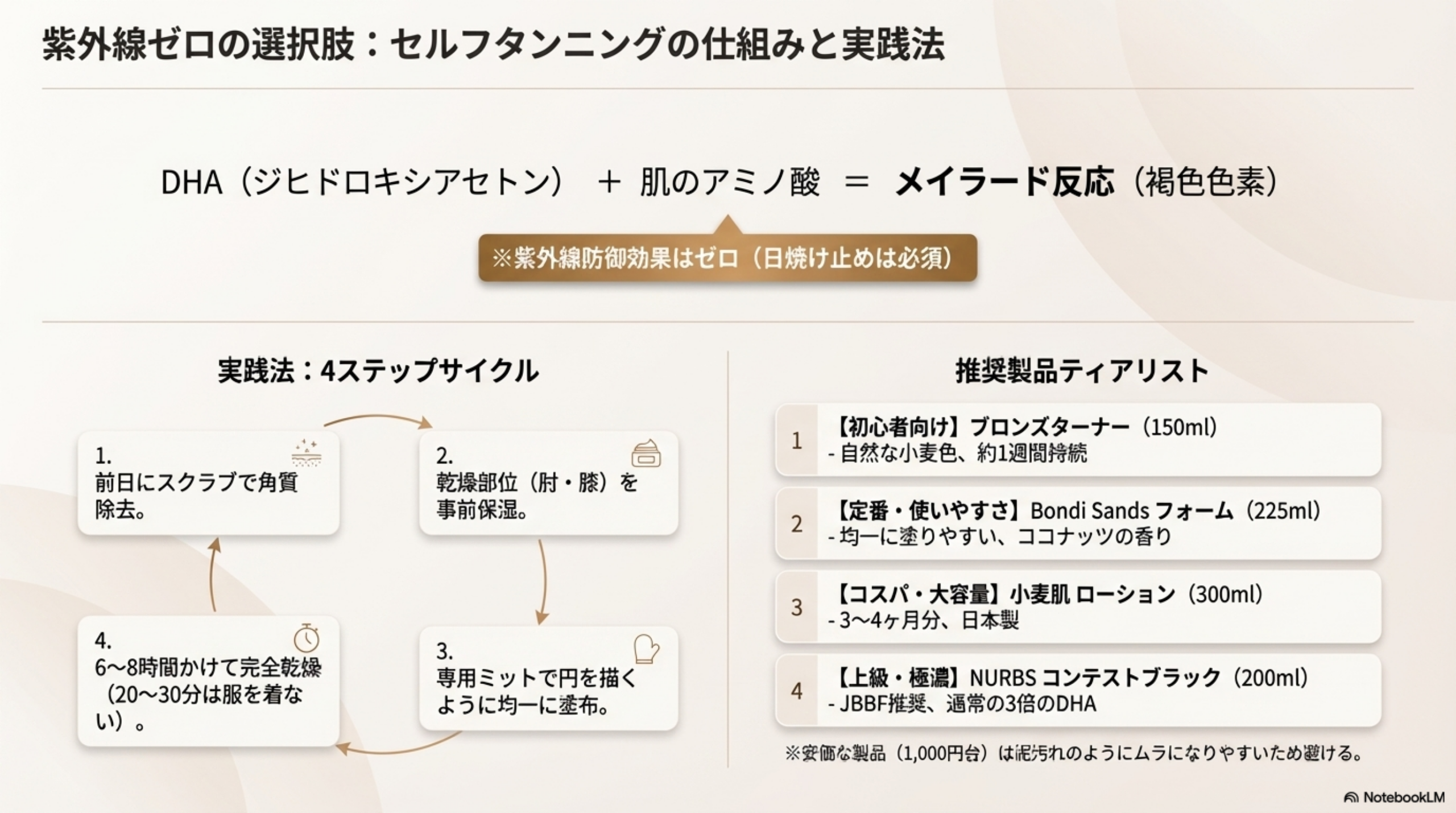 特に高濃度DHA配合のセルフタンニング製品(後述のNURBSコンテストブラックなど)を併用すると、短期間でかなり濃い色味を実現できます。