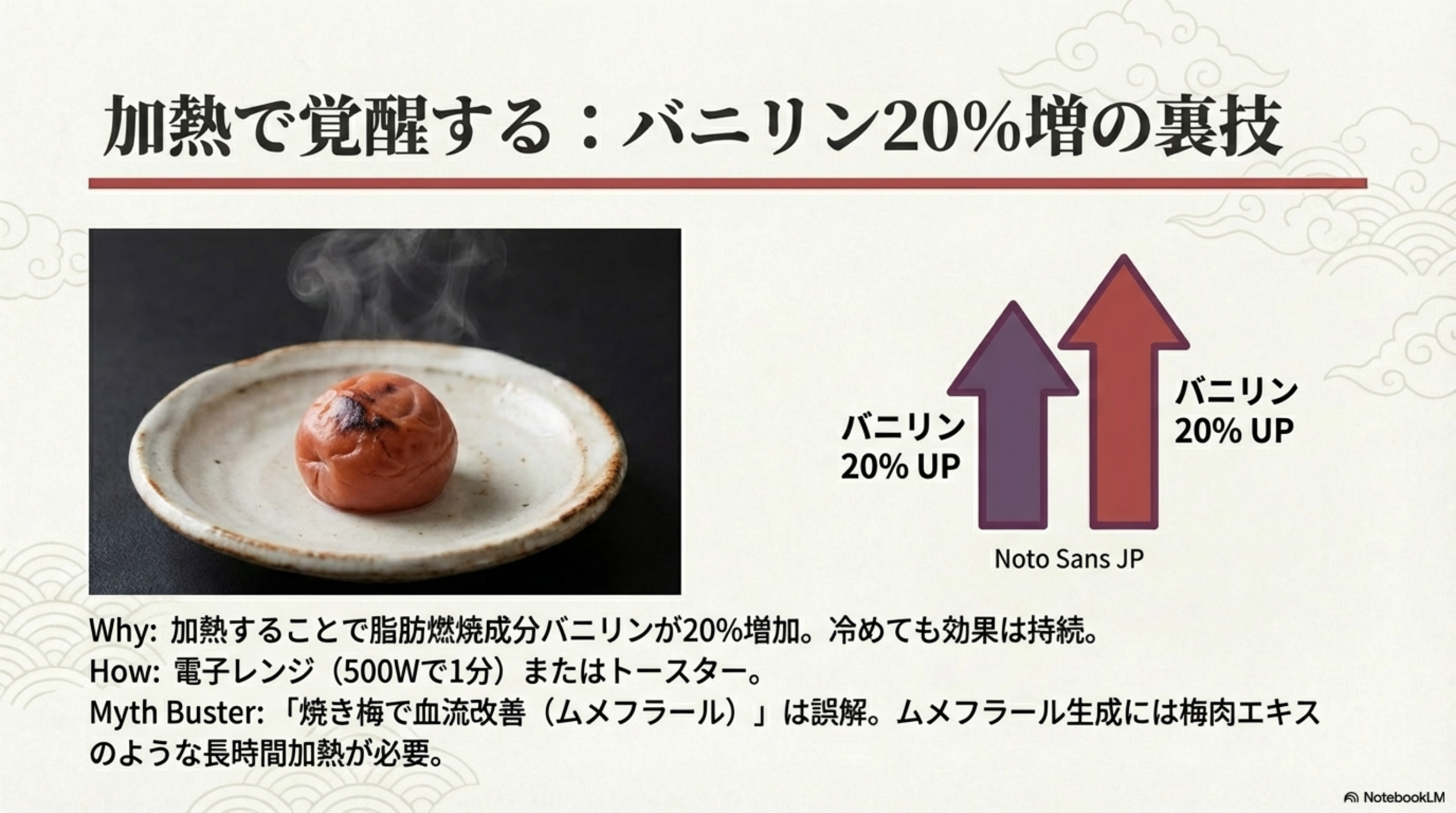 バニリンが約20%増加し、脂質代謝への寄与が期待できます。なお「ムメフラール」は梅肉エキスのように長時間加熱濃縮しないと有意に生成されないため、焼き梅干し程度の加熱では梅肉エキスと同等の効果は期待しにくいです。