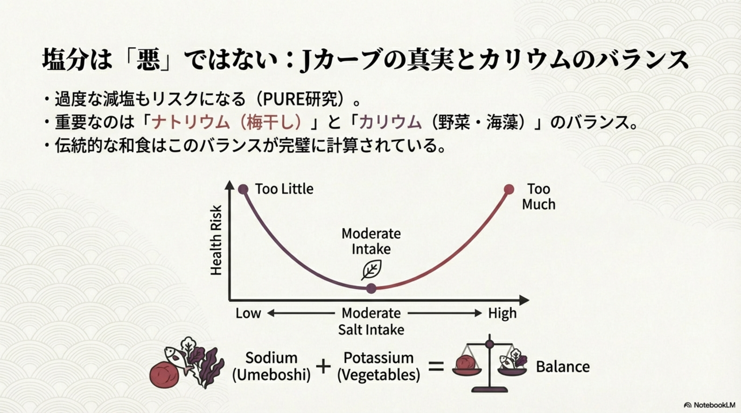 塩分摂取で重要なのは、ナトリウム単独の量ではなくカリウムとのバランスです。野菜・海藻・果物などカリウム豊富な食品と一緒に摂ることで、ナトリウムの排出が促進されます。伝統的な和食パターン(梅干し+味噌汁+野菜+魚介類+海藻)は、このバランスを自然に実現する優れた食事構成です。
