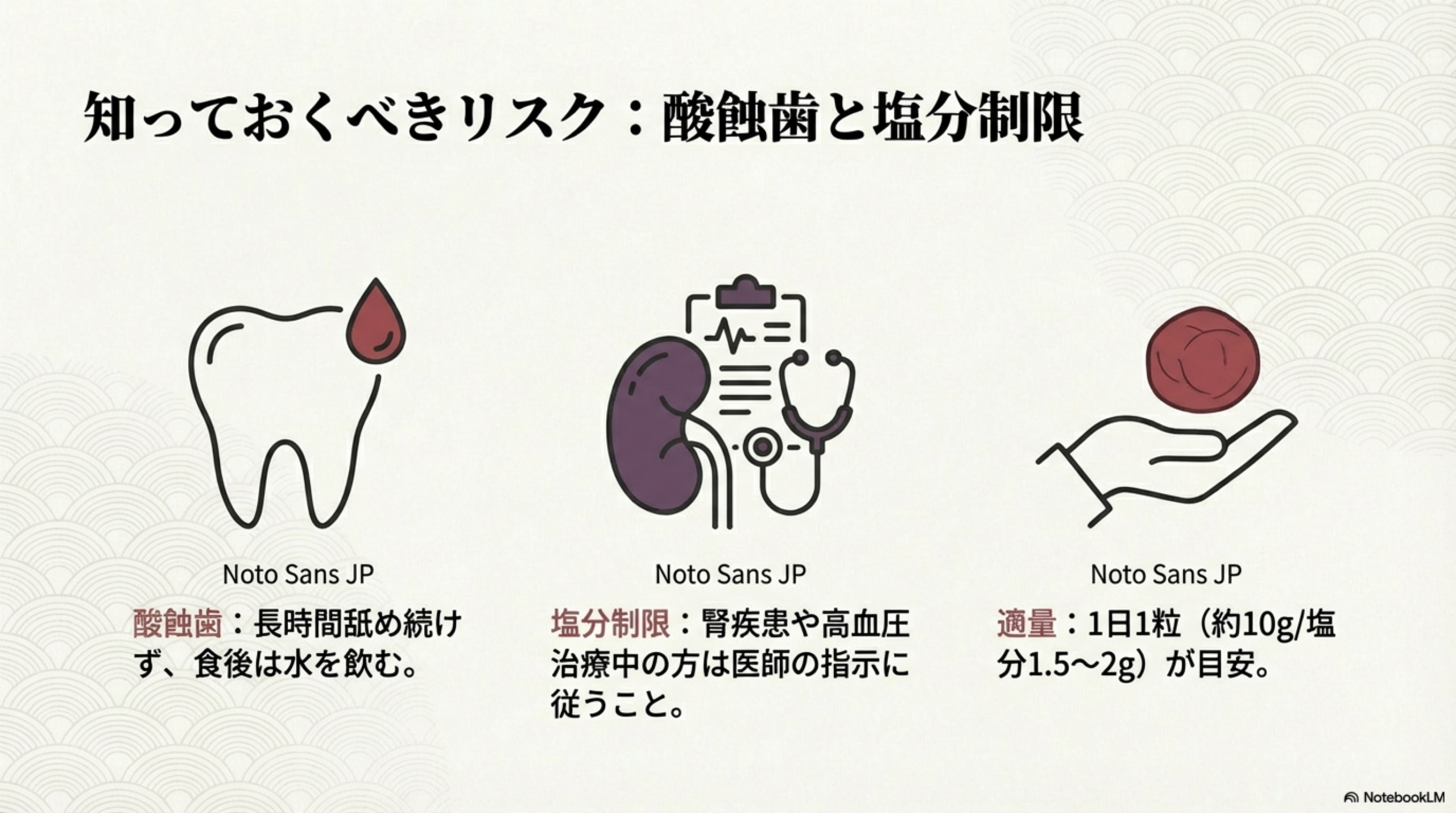 • ⚠️ 唾液の分泌量が少ない方は特に注意(梅干しの唾液促進作用で一定の保護効果はあるが、過信は禁物)