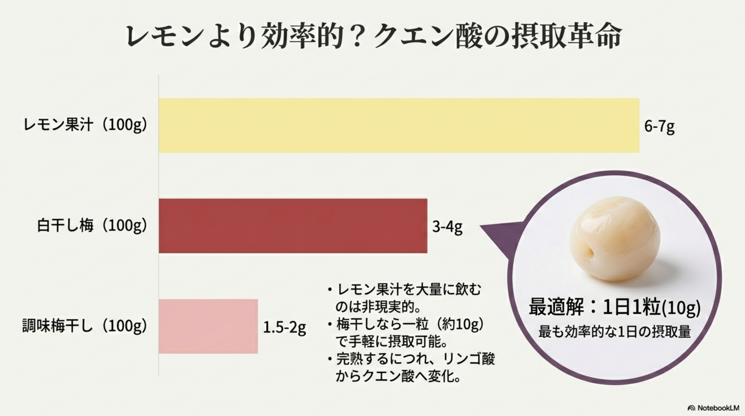 100gあたりの含有量ではレモン果汁の方が多いものの、レモン果汁をそのまま大量に飲むのは現実的ではありません。梅干しは1粒(約10g)で手軽にクエン酸を摂取できるという点で、日常的な供給源として優れています。
