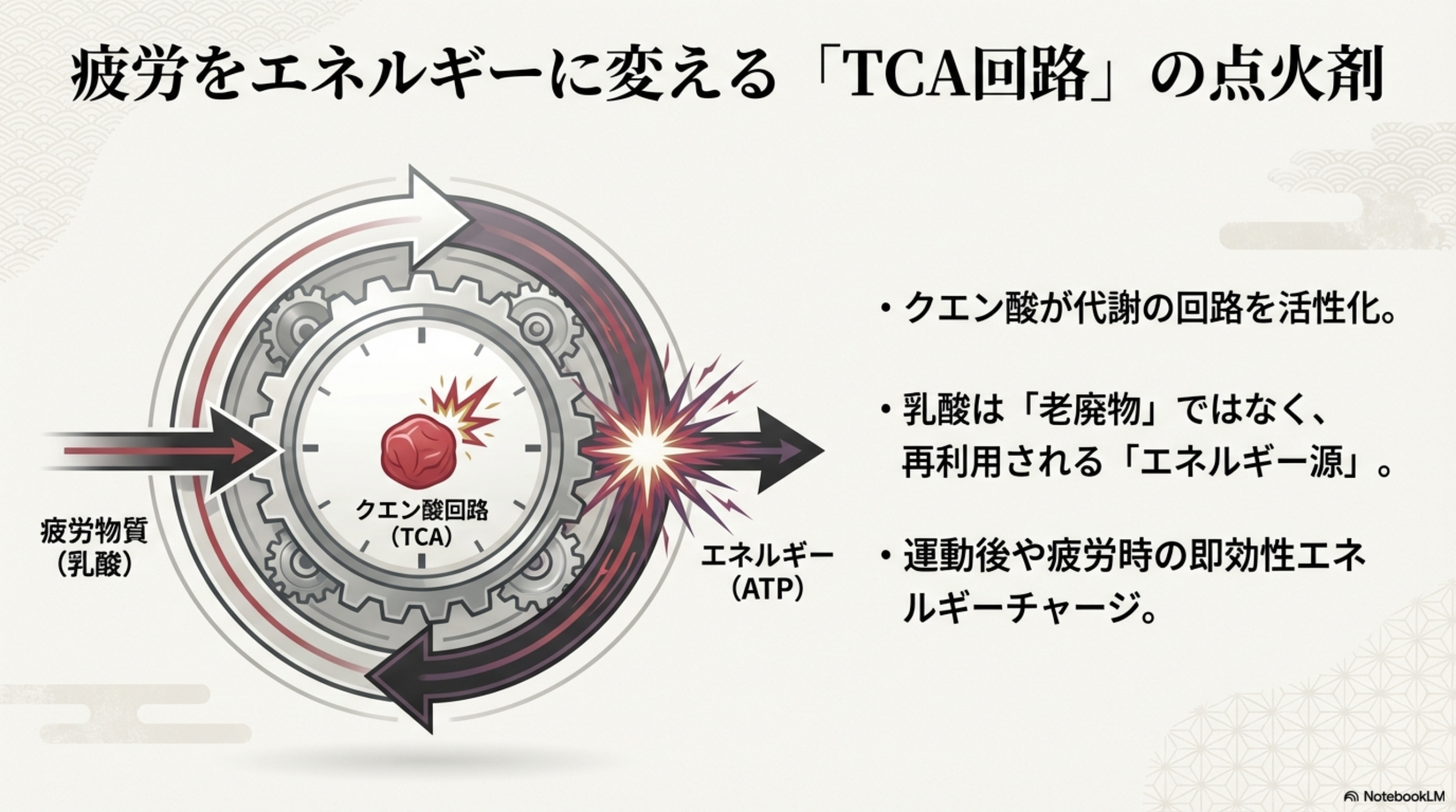 なお、かつては「乳酸=疲労物質」と説明されてきましたが、現在の運動生理学では乳酸はエネルギー源として再利用される物質であることがわかっています。クエン酸の疲労回復効果は、乳酸を「分解する」のではなく、TCA回路を活性化してエネルギー産生全体を効率化するメカニズムによるものです。
